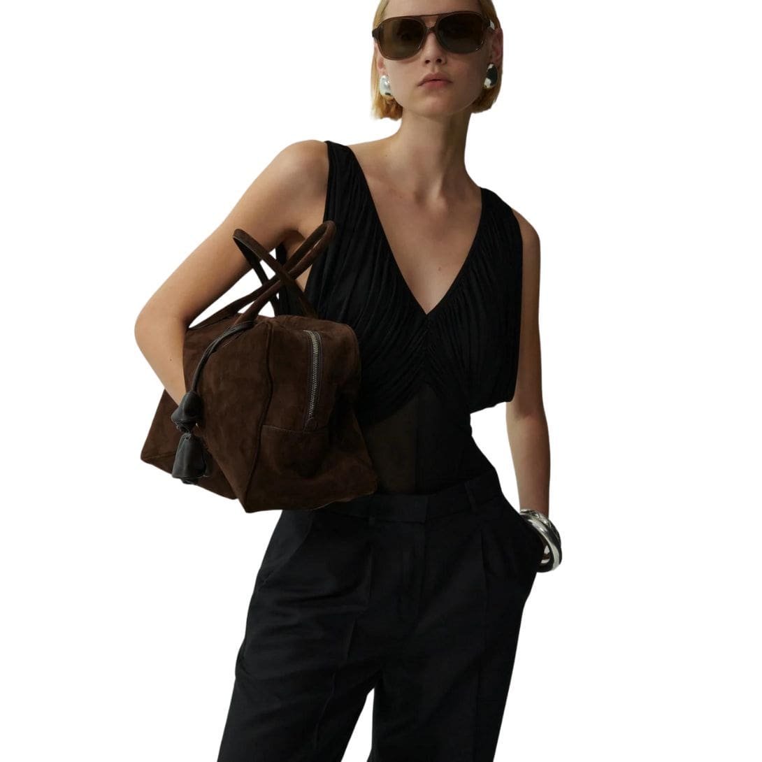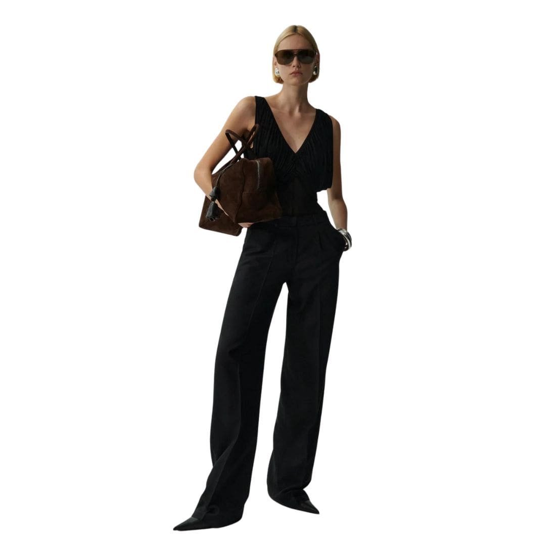 In summary, Magda Butrym’s ruched V-neck bodysuit in black is a beautifully crafted, versatile garment that combines modern design with classic elegance. Its ruched center and draped underarm detailing make it a unique and stylish choice for any occasion, whether dressed up or down. This bodysuit is sure to become a favorite go-to piece for those who appreciate sophisticated, contemporary fashion.