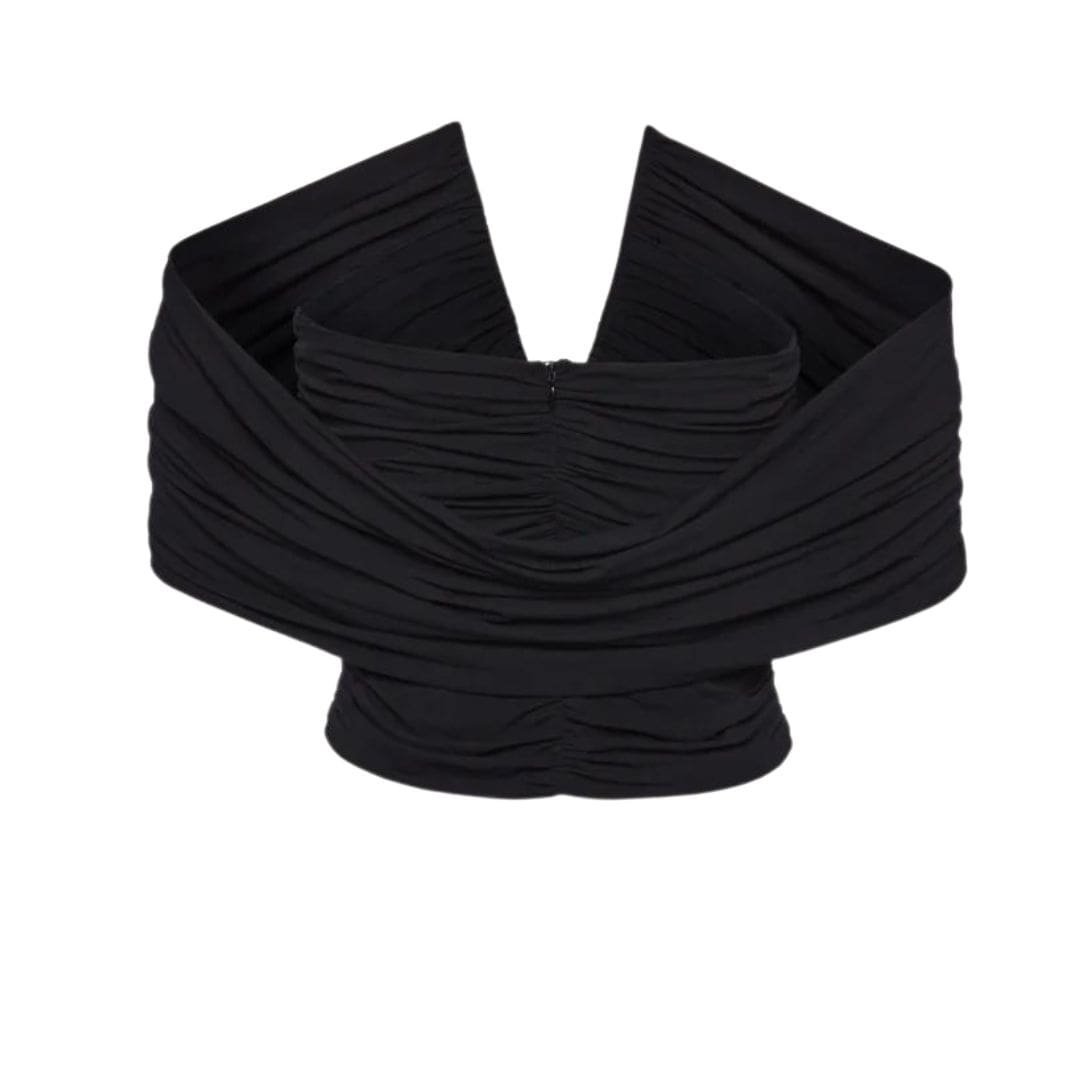 Magda Butrym Ruched V Neck Wrap Blouse In Black seasonal jersey top introduces a striking design with structured wiring at the chest, emphasizing a deep V neckline that enhances the silhouette. The off-the-shoulder style is achieved through a wrap effect around the arms, creating a chic and contemporary look.
