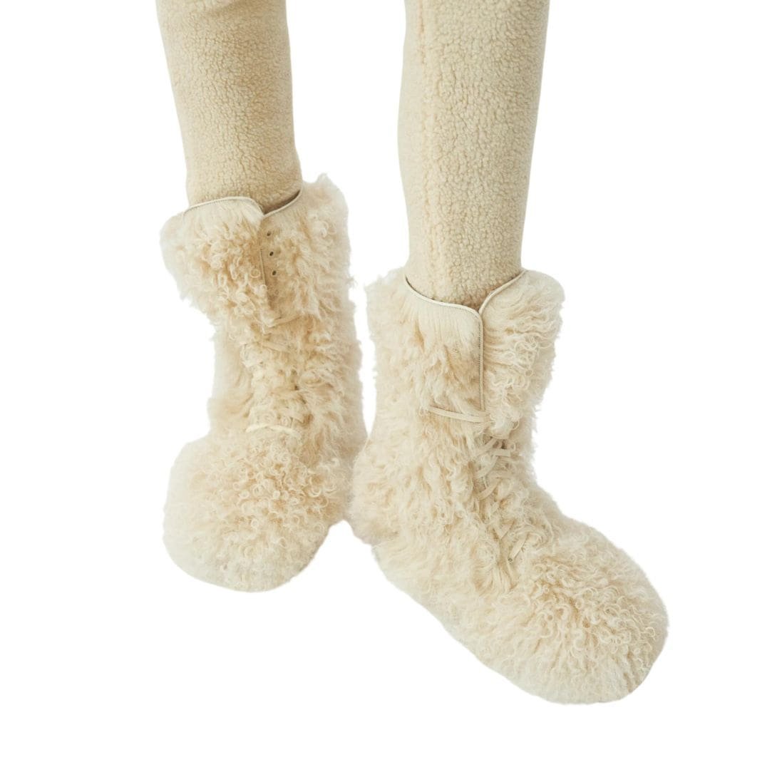 Experience the epitome of urban sophistication with our signature MAGDA BUTRYM SHEARLING COMBAT BOOTS IN CREAM. These timeless classics are designed to make a statement, featuring a mid-calf height, robust soles, and a lace-up front closure for a perfect fit every time. But what sets these boots apart is their luxurious shearling covering, elevating them to a whole new level of style and comfort.