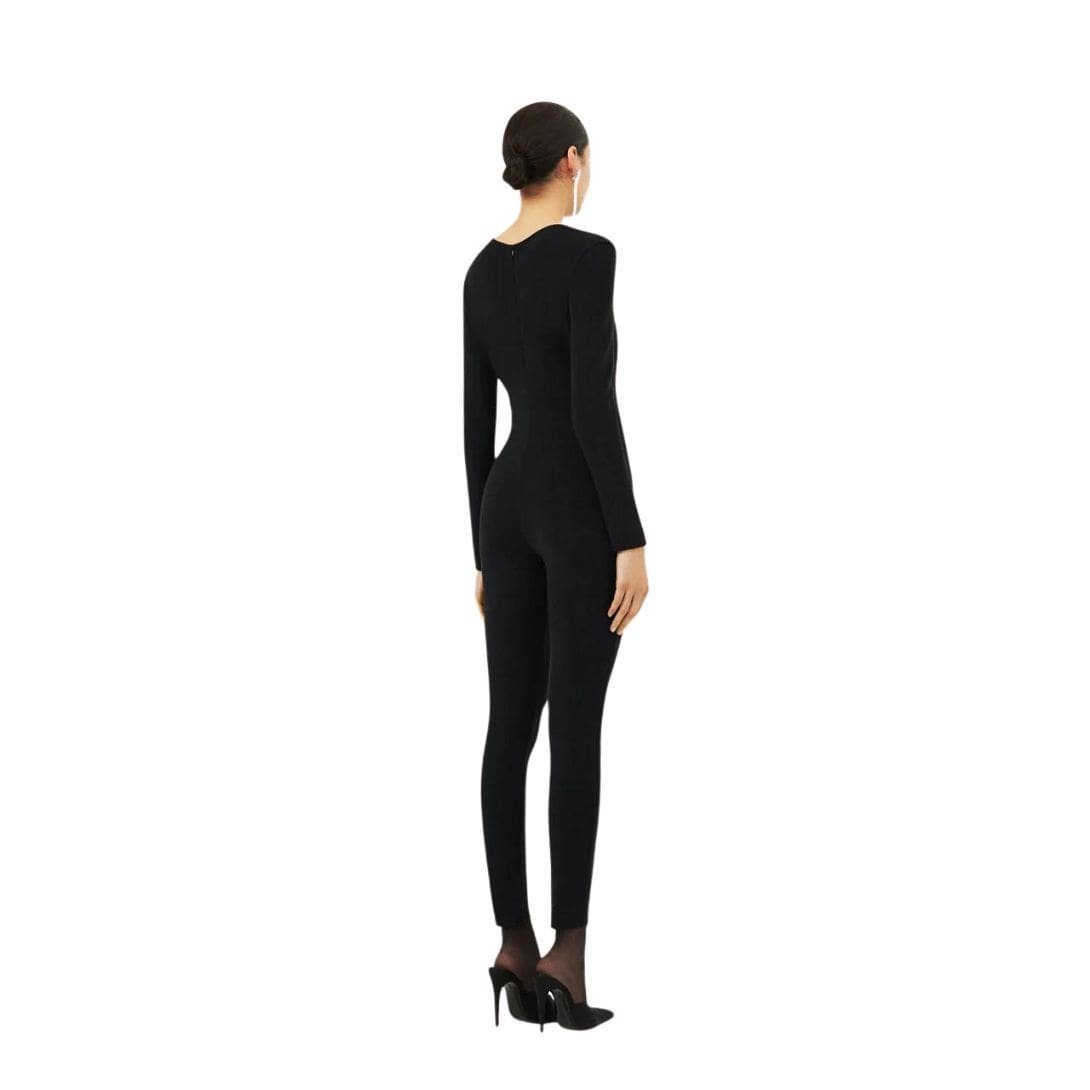 The silk knit fabric lends a luxurious feel to the jumpsuit, offering a smooth and soft texture against the skin. The long sleeves provide coverage while complementing the sleek, skinny legs that elongate the silhouette. The open bustier neckline adds a touch of daring sophistication, enhancing the jumpsuit’s appeal for evening events or stylish occasions.