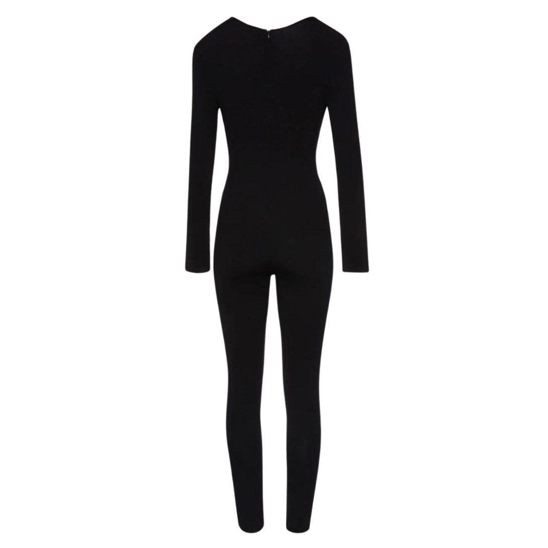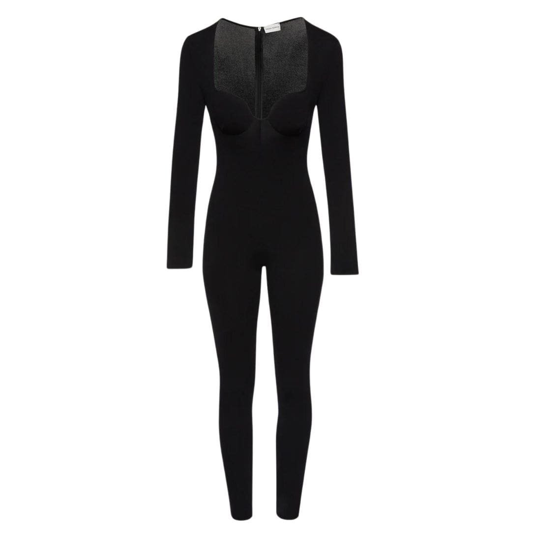 Magda Butrym silk knit bustier jumpsuit in black combines elegance with modern allure, featuring long sleeves, a form-fitting silhouette, and an open bustier neckline. This sophisticated piece is crafted to highlight the body’s contours while maintaining comfort and style.