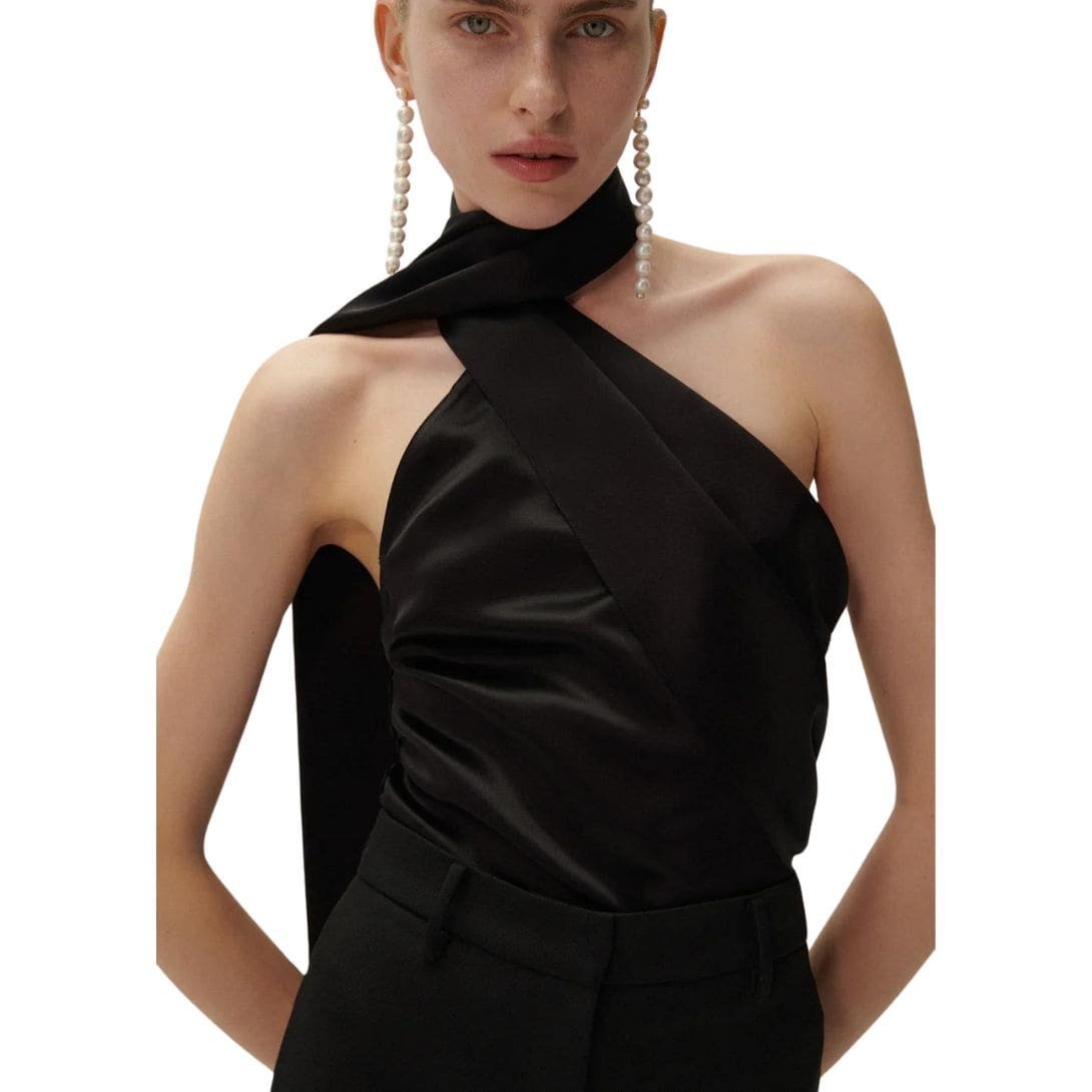 This season’s essential piece from Magda Butrym silk wrap neck top in black detail that evokes a glamorous scarf effect, complemented by a long sash for added drama. Crafted from jersey fabric, this tank top combines comfort with elevated style through its intricate wrap detailing along the body.