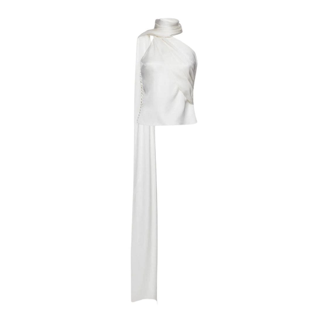 The wrap-around neck design not only adds a touch of sophistication but also allows for versatile styling options. It creates a flattering silhouette that accentuates the neckline while providing a hint of allure. The long sash adds a dramatic flair, enhancing the top’s visual appeal and making it a statement piece suitable for various occasions.