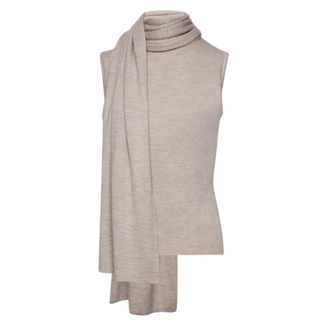 Perfect for layering or wearing on its own, this sleeveless turtleneck top in a wool, silk, and cashmere blend offers versatility for various occasions. Pair it with tailored trousers for a polished office look or with jeans for a casual yet refined ensemble. The neutral beige hue adds to its versatility, allowing it to complement a wide range of outfits and color palettes.