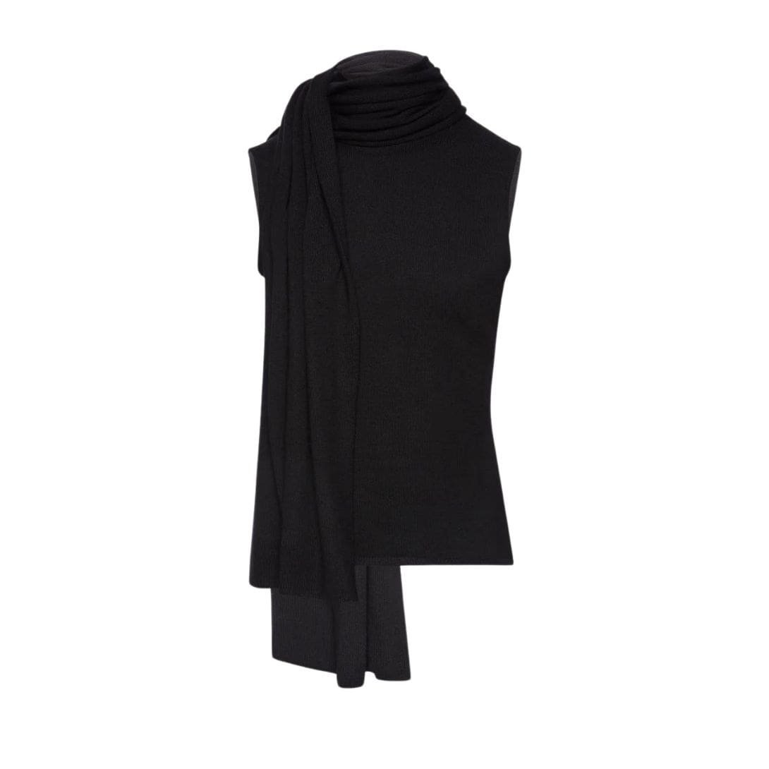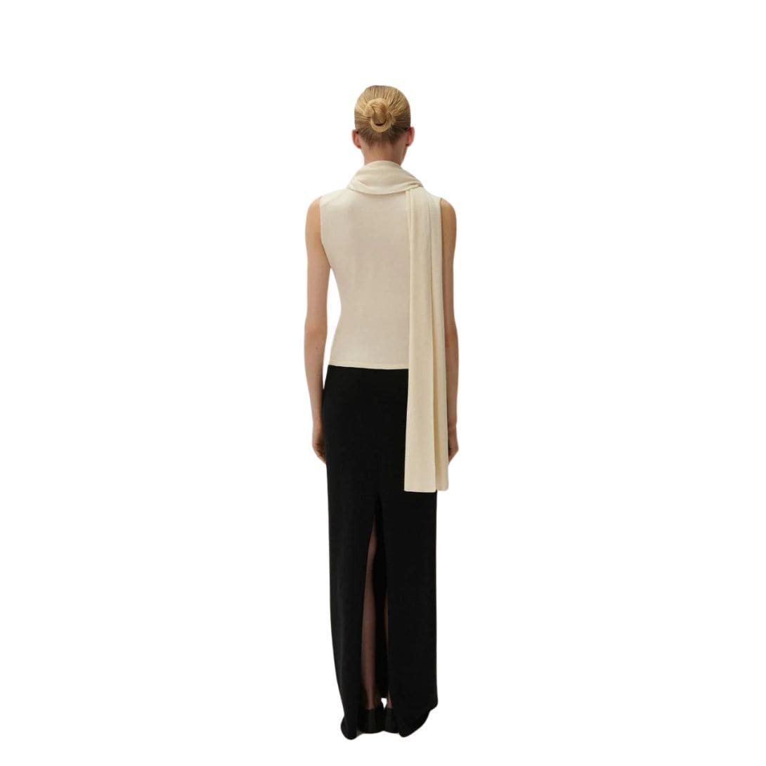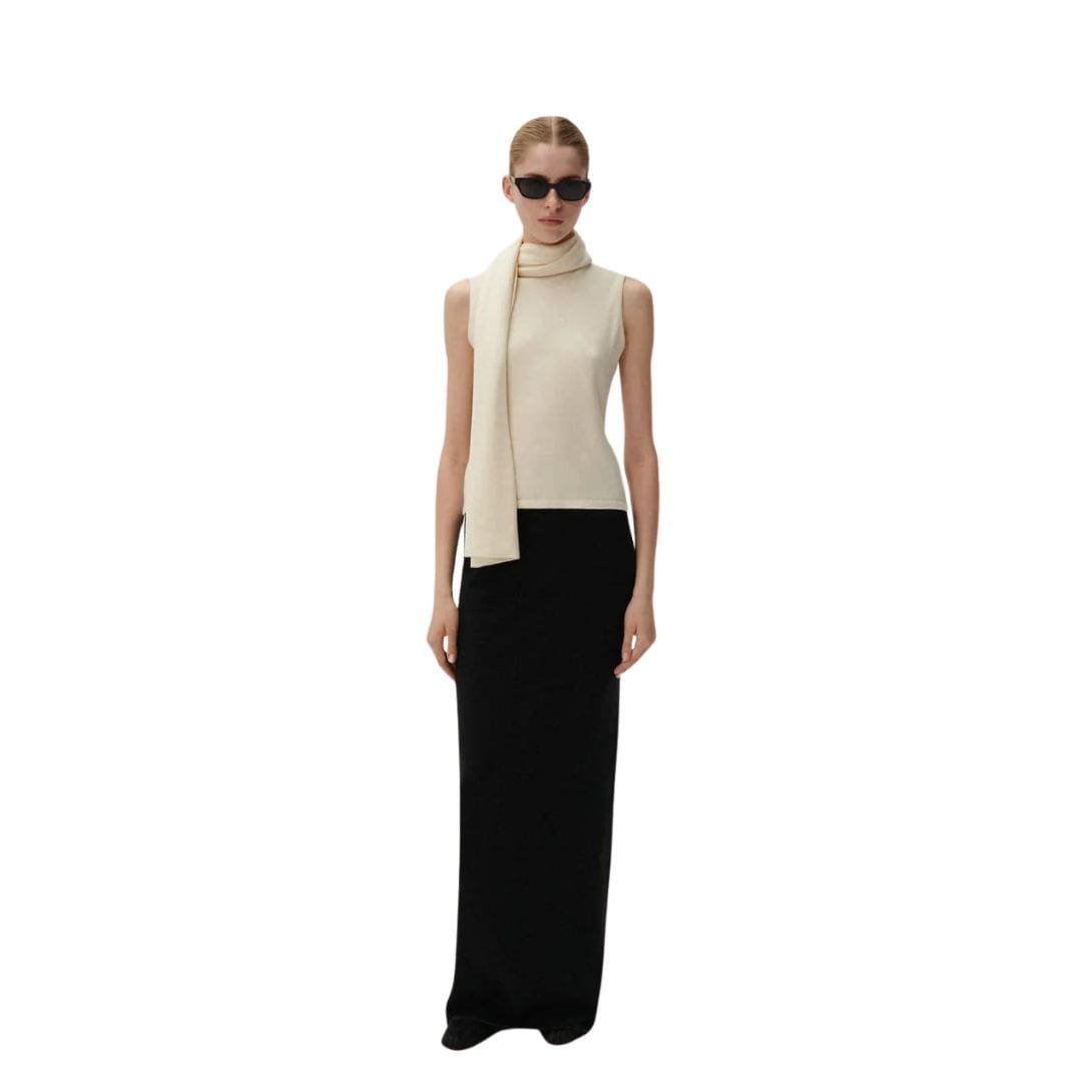 The Magda Butrym Sleeveless High Neck Knit Top in cream is a statement piece that effortlessly combines elegance with modern design. This luxurious top features a sophisticated turtleneck and a dramatic sash scarf detail that adds a touch of flair and refinement.