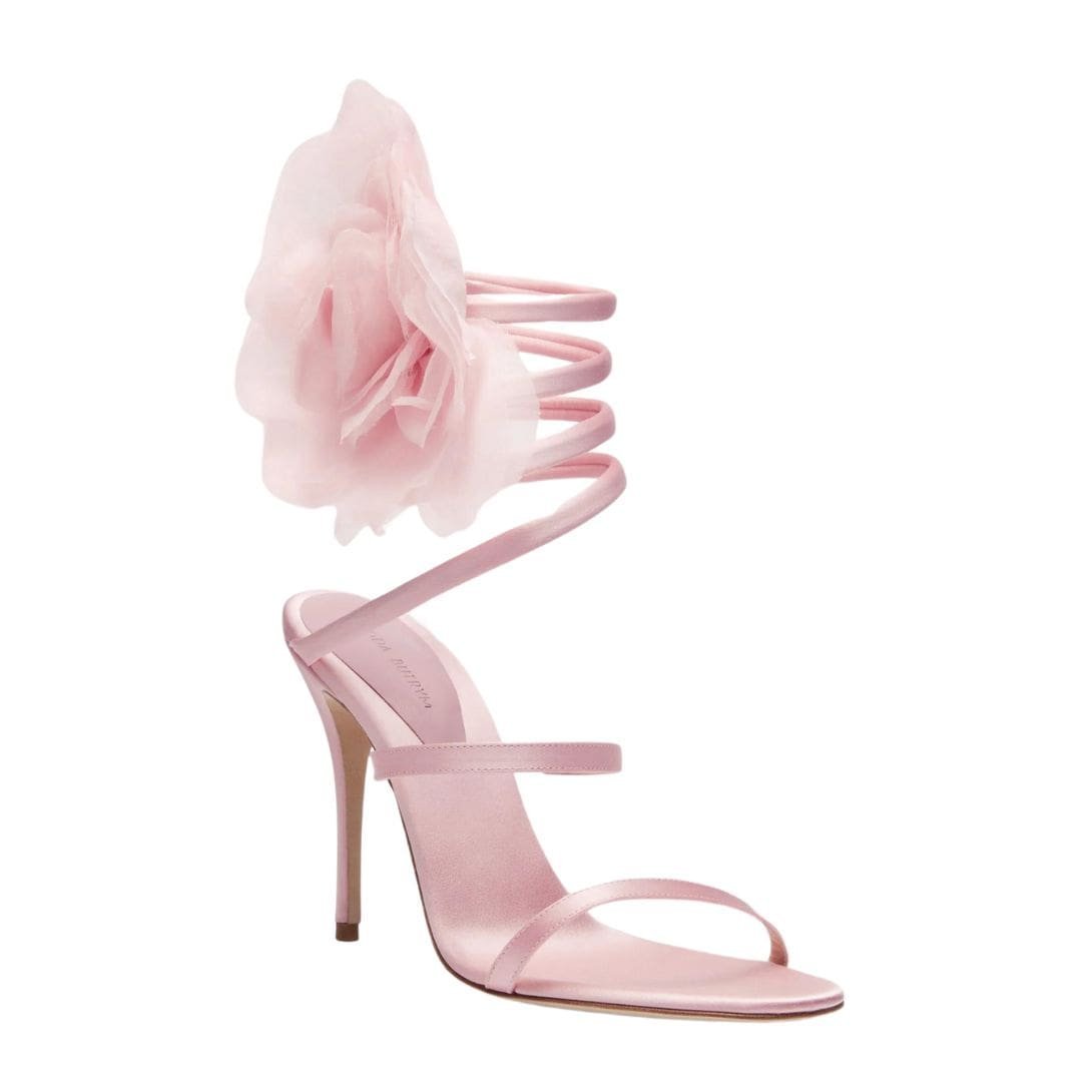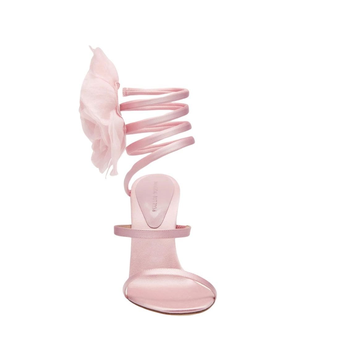 Introducing the latest creation from Magda Butrym: a captivating pair of MAGDA BUTRYM SPIRAL SILK-ORGANZA FLOWER HEEL SANDALS IN PINK that seamlessly blend modern design with timeless elegance. These sandals are distinguished by a mesmerizing feature—a strap that elegantly spirals up to the ankle, imparting a sense of movement and grace to the wearer’s stride.