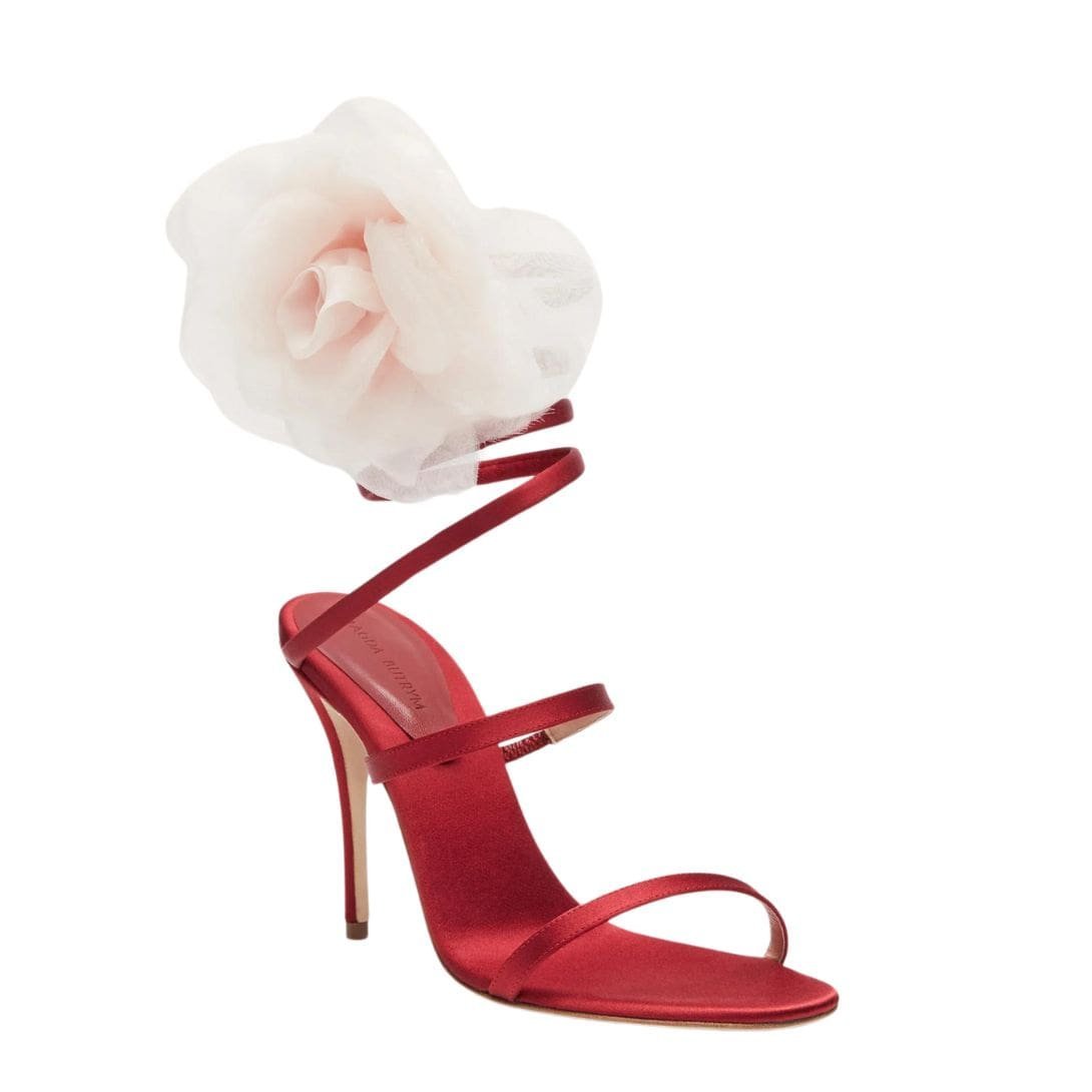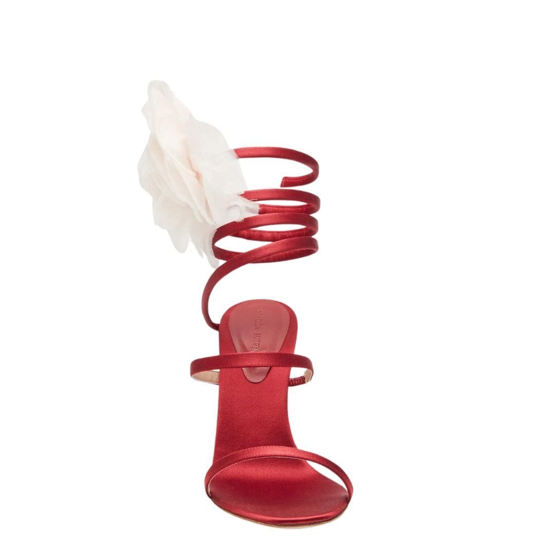Introducing the latest creation from Magda Butrym: a captivating pair of MAGDA BUTRYM SPIRAL SILK-ORGANZA FLOWER HEEL SANDALS IN RED SATIN that seamlessly blend modern design with timeless elegance. These sandals are distinguished by a mesmerizing feature—a strap that elegantly spirals up to the ankle, imparting a sense of movement and grace to the wearer’s stride.