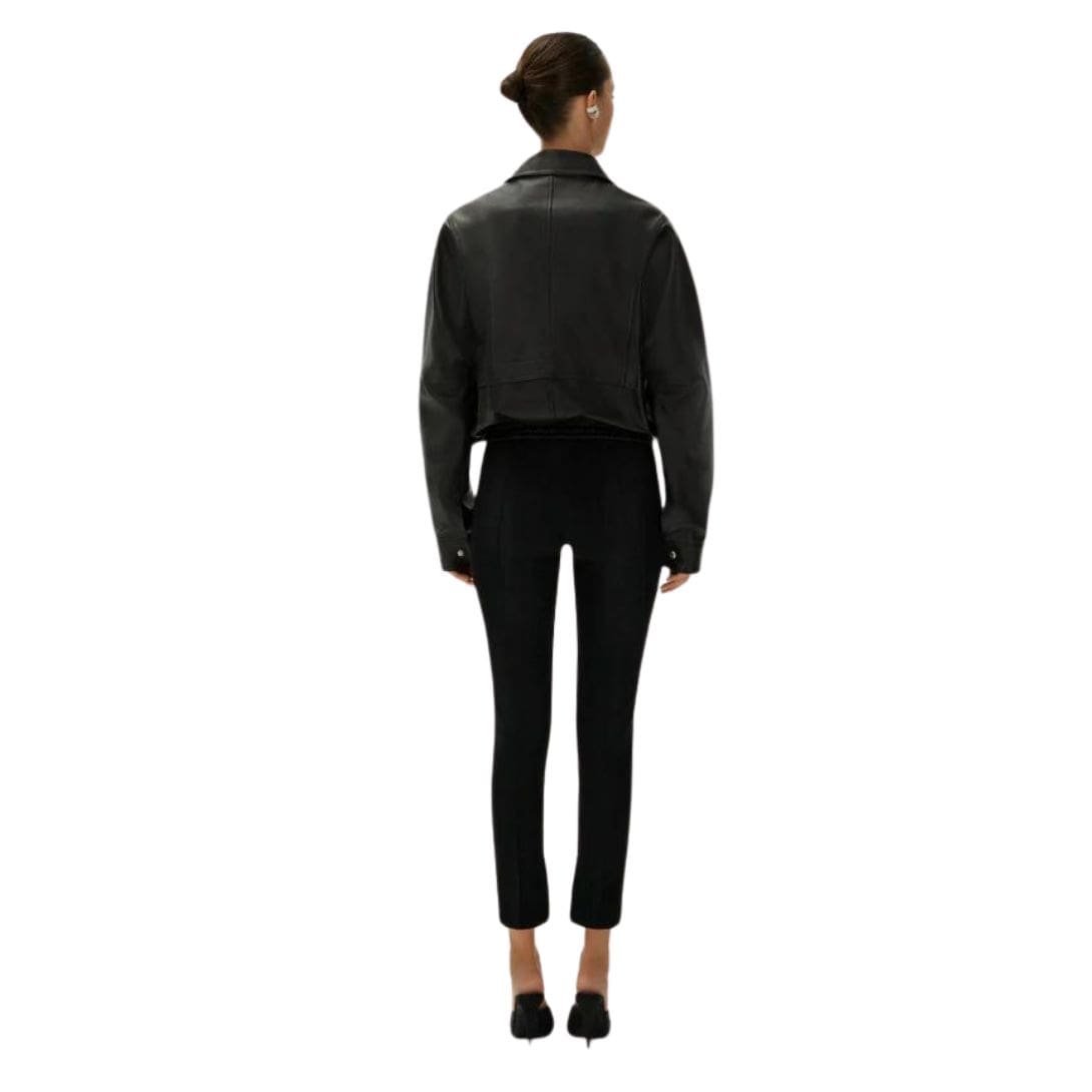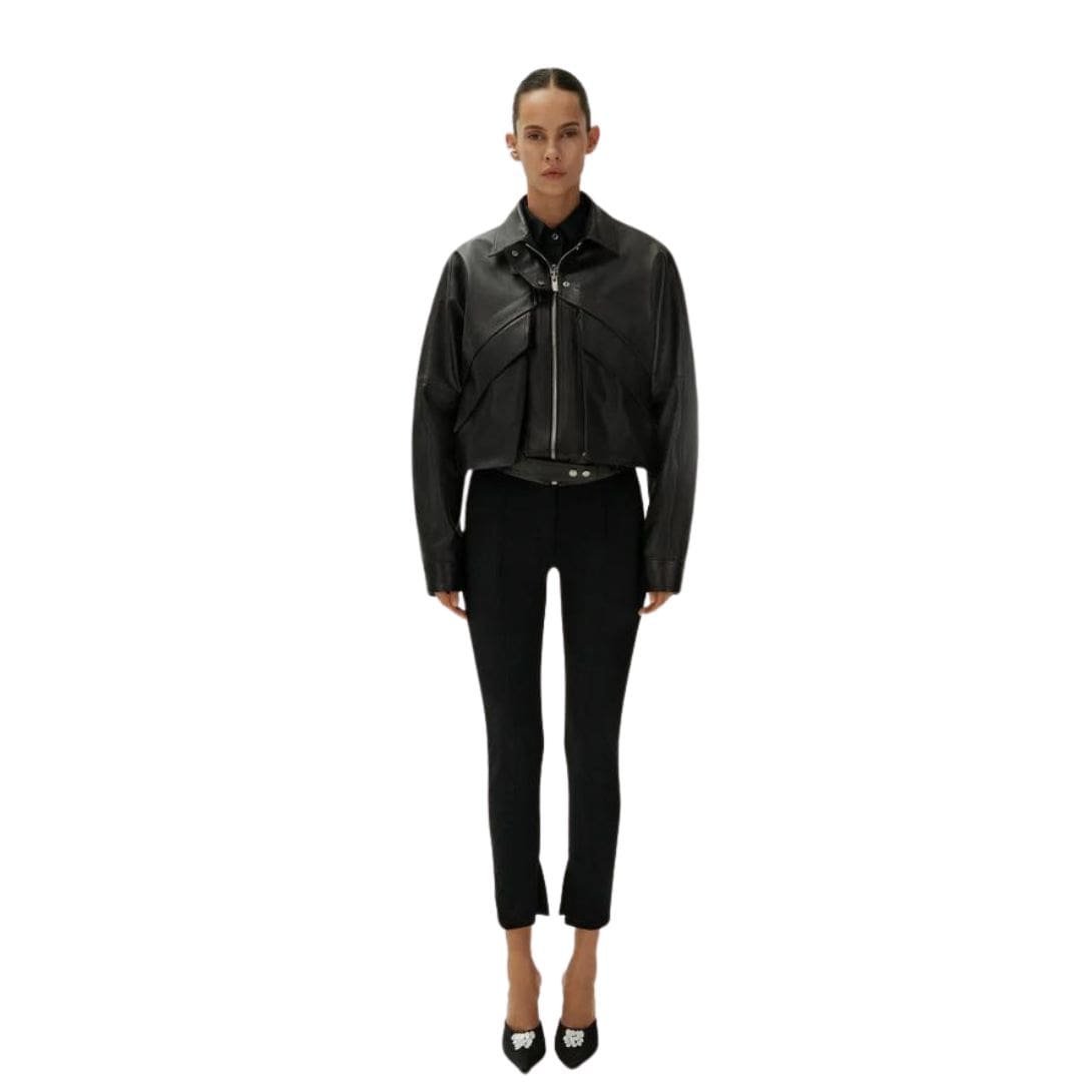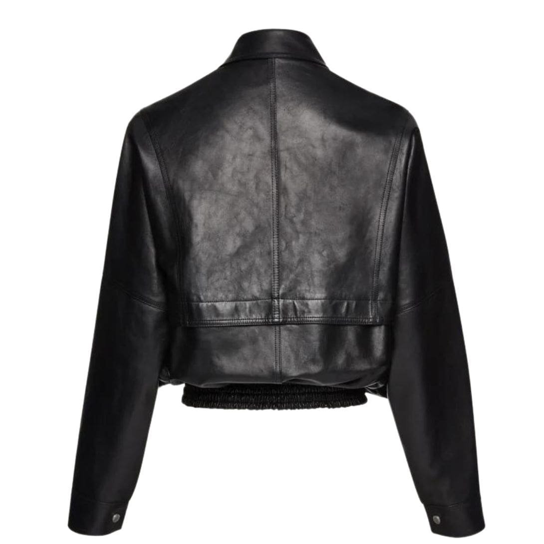 Introducing the Magda Butrym Vintage Bomber Jacket In Black Leather. a stunning oversized piece crafted from premium black leather. This jacket embodies a distinctly vintage aesthetic while maintaining a contemporary edge, making it a standout addition to any fashion-forward wardrobe.