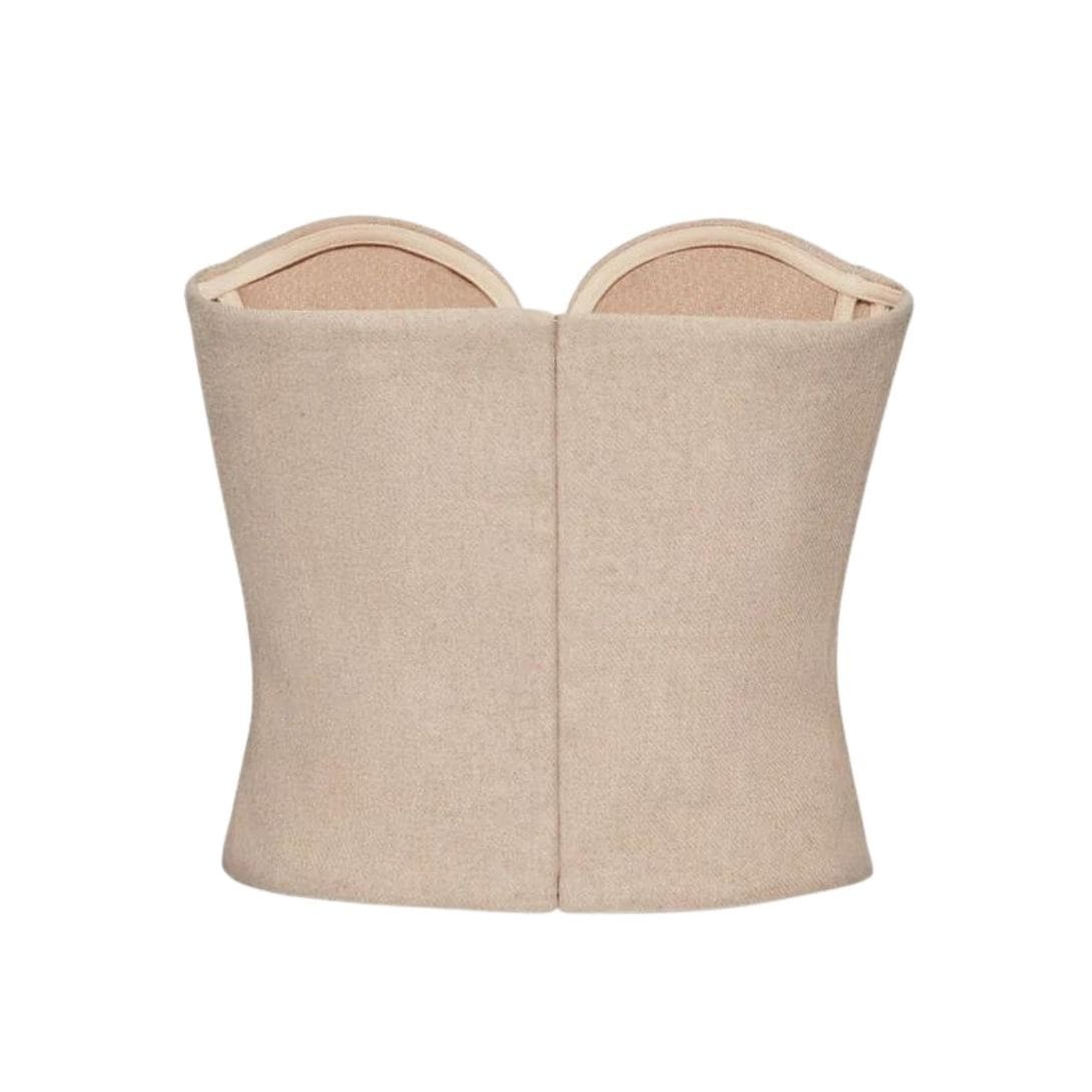 Magda Butrym wool corset top in beige epitomizes sophistication and contemporary style. Whether paired with tailored trousers for a chic office look or worn with a flowing skirt for a formal event, this top makes a statement with its combination of classic corsetry and seasonal detailing.