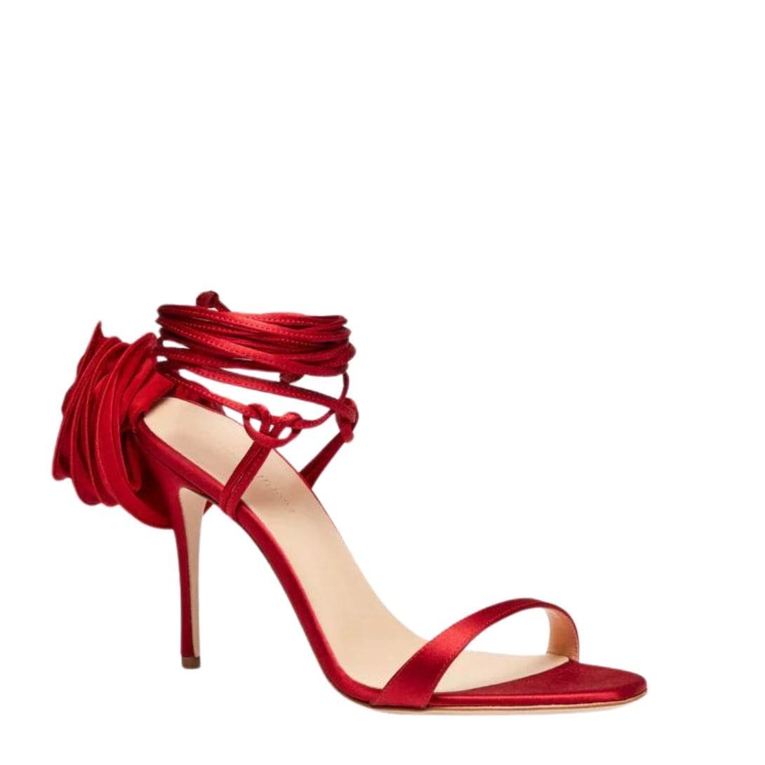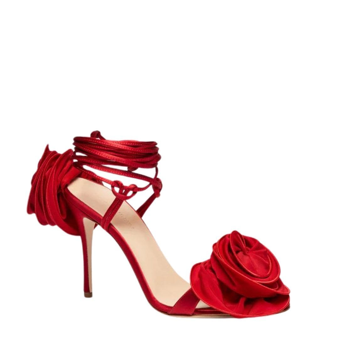 These flowers are meticulously crafted with attention to detail, featuring lifelike petals that create a natural, delicate appearance. The deep red hue of the flowers harmonizes beautifully with the dark red satin, resulting in a cohesive and sophisticated look. The combination of luxurious materials, intricate design, and charming floral embellishments makes these sandals a true statement piece.