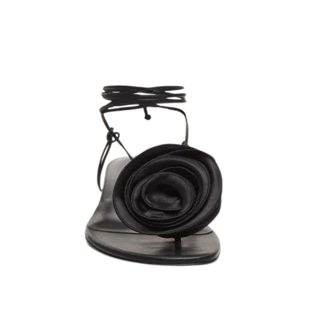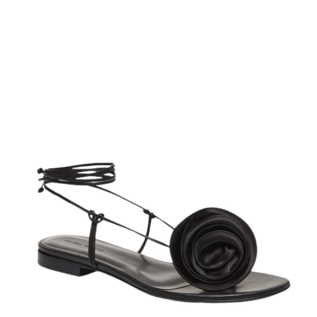 MAGDA BUTRYM WRAP AROUND FLAT FLOWER SANDALS IN BLACK SATIN