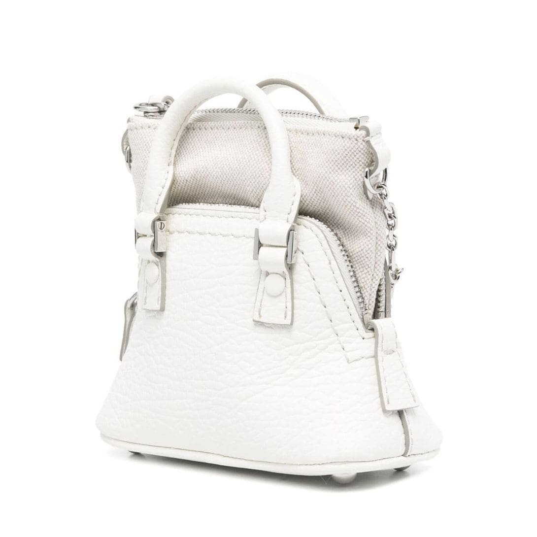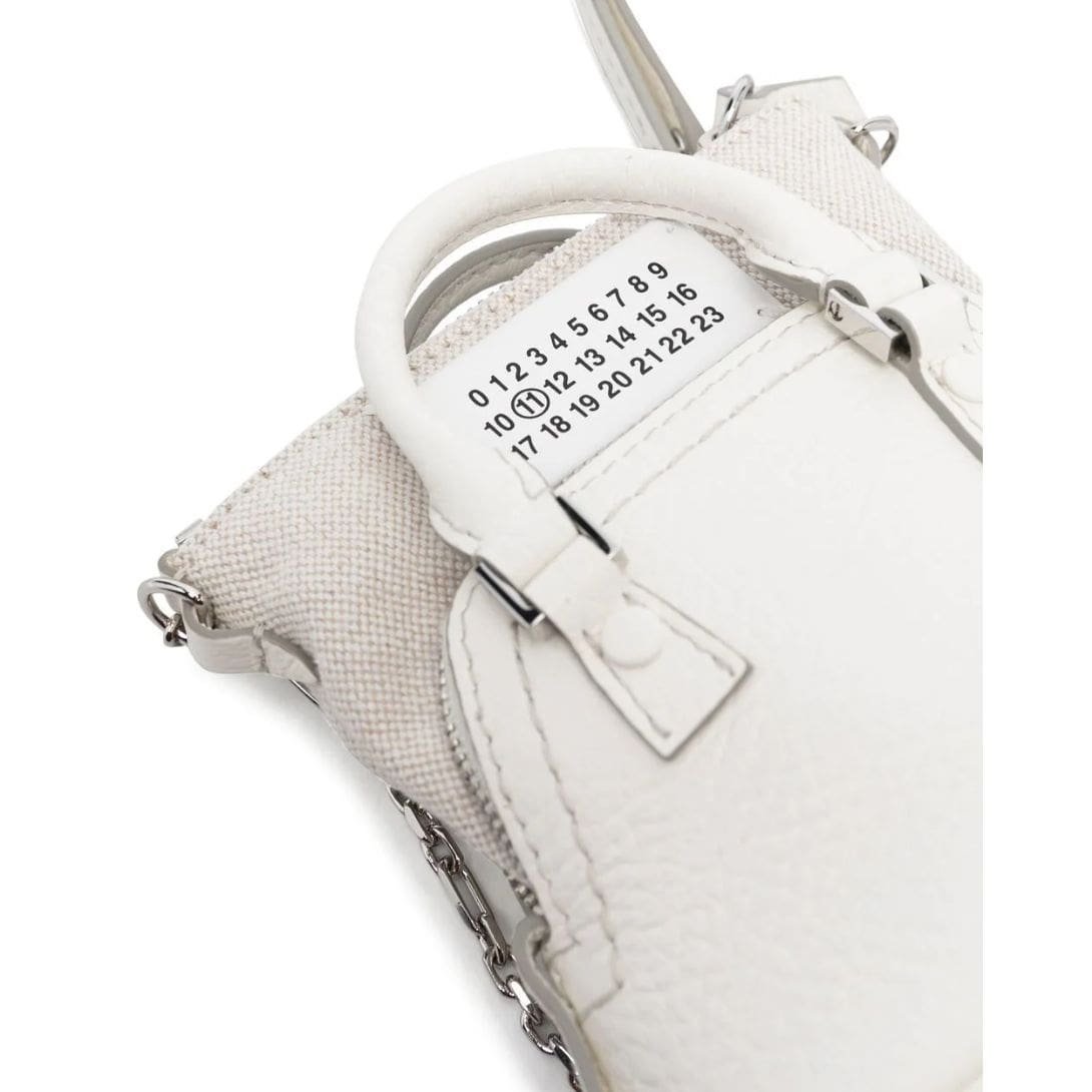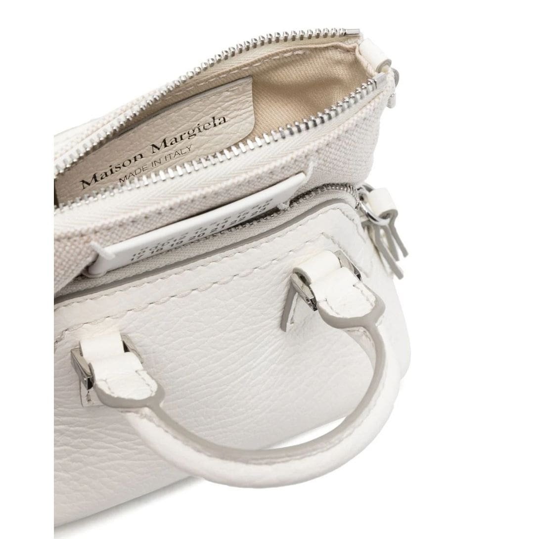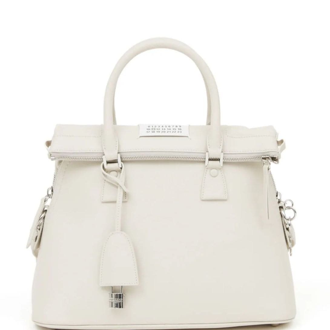 Maison Margiela 5AC Classique baby Top-handle bag Crafted in Italy, this exquisite accessory showcases a pristine white hue crafted from premium calf leather. Its design features intricate layers, adding depth and dimension to its aesthetic appeal. A distinctive number patch adorns the front, accentuating its contemporary charm. Secured by a top zip closure, it ensures easy access to essentials while maintaining a sleek silhouette. For added versatility, the bag comes with a detachable chain-link shoulder strap, allowing it to be carried in multiple ways. Meticulously crafted with a blend of calf leather and fabric, this piece epitomizes both sophistication and durability.