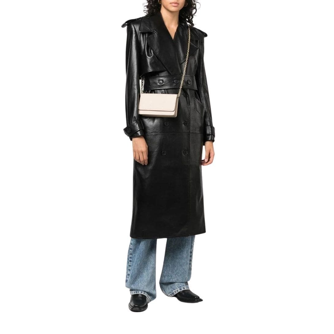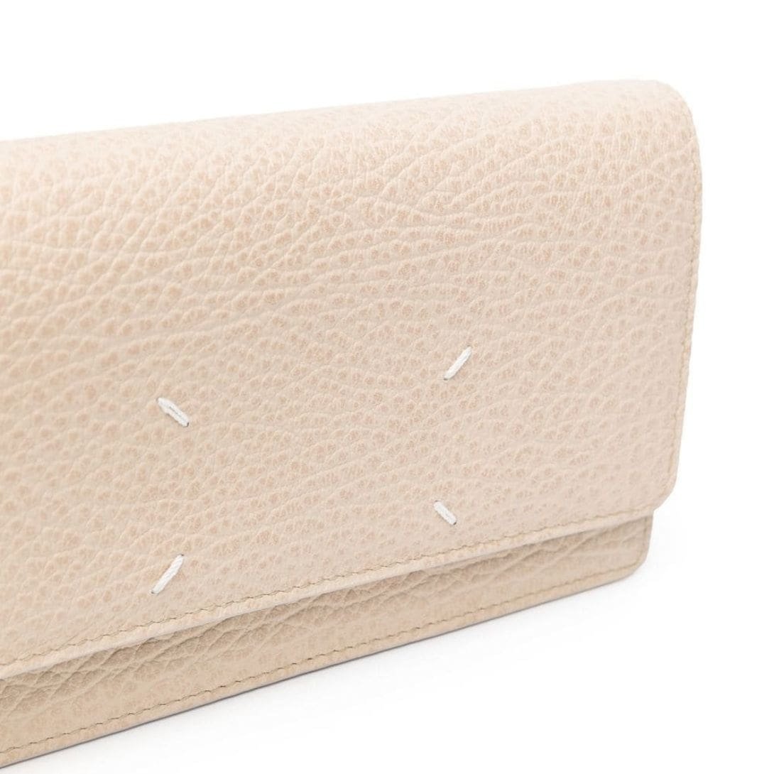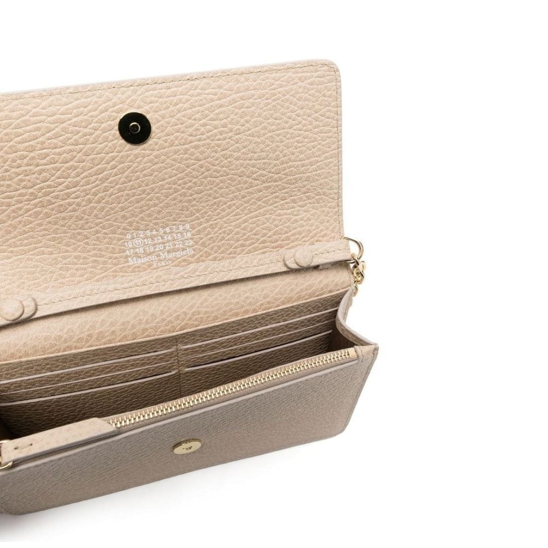 Maison Margiela Four-Stitch Leather Wallet-on-Chain, Crafted in Italy, this wallet-on-chain by Maison Margiela features a sleek design in beige calf leather, adorned with the signature four-stitch logo. It comes with gold-tone hardware, a detachable chain-link shoulder strap, and a foldover top with press-stud fastening.