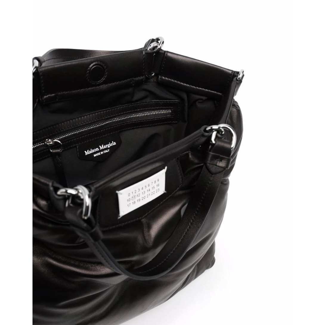 Introducing the Maison Margiela medium Glam Slam tote bag, a luxurious creation meticulously crafted in Italy by Maison Margiela. This exquisite piece showcases a sleek black design, crafted from sumptuous sheepskin with a distinctive quilted texture.