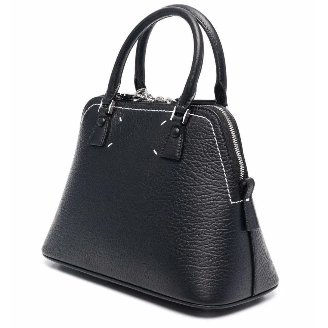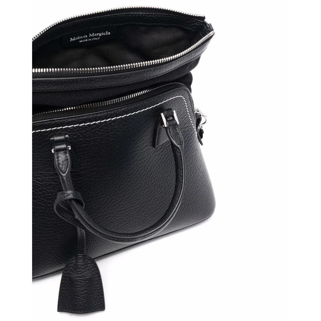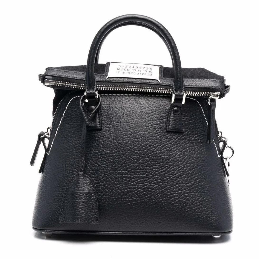 Maison Margiela Mini 5AC Leather Tote Bag, Crafted in Italy, this mini 5AC leather tote bag from Maison Margiela showcases a sophisticated black and white color scheme. Made from premium leather with a pebbled texture, it features a logo patch on the front and contrasting stitching for added visual interest. The bag includes a leather tag, an internal logo patch, and multiple compartments for convenient storage. It can be carried by the two top handles or the detachable shoulder strap.