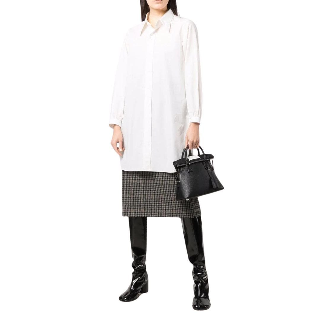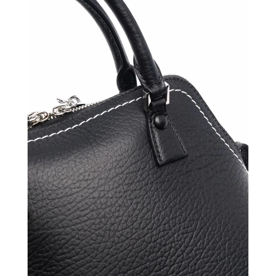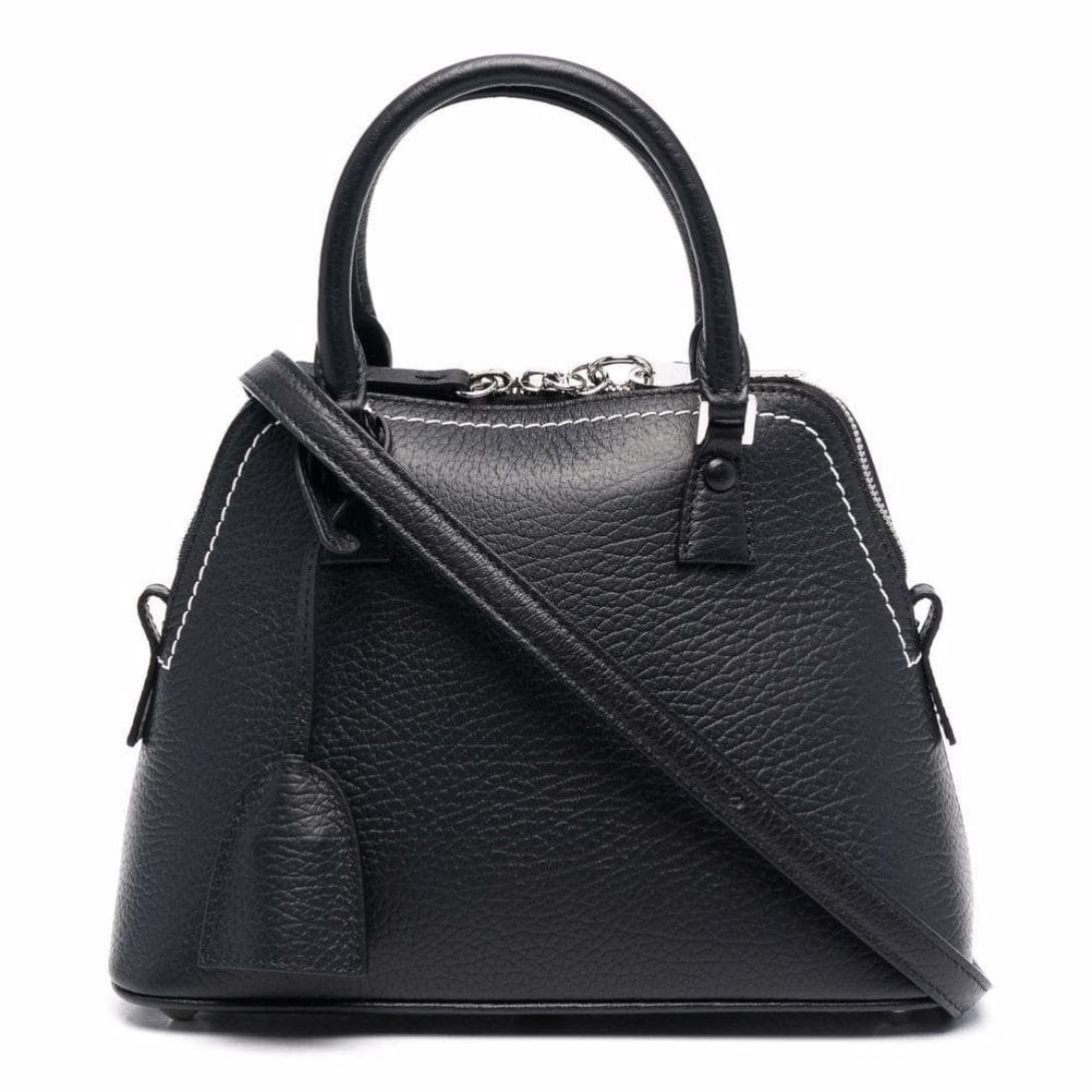 Maison Margiela Mini 5AC Leather Tote Bag, Crafted in Italy, this mini 5AC leather tote bag from Maison Margiela showcases a sophisticated black and white color scheme. Made from premium leather with a pebbled texture, it features a logo patch on the front and contrasting stitching for added visual interest. The bag includes a leather tag, an internal logo patch, and multiple compartments for convenient storage. It can be carried by the two top handles or the detachable shoulder strap.