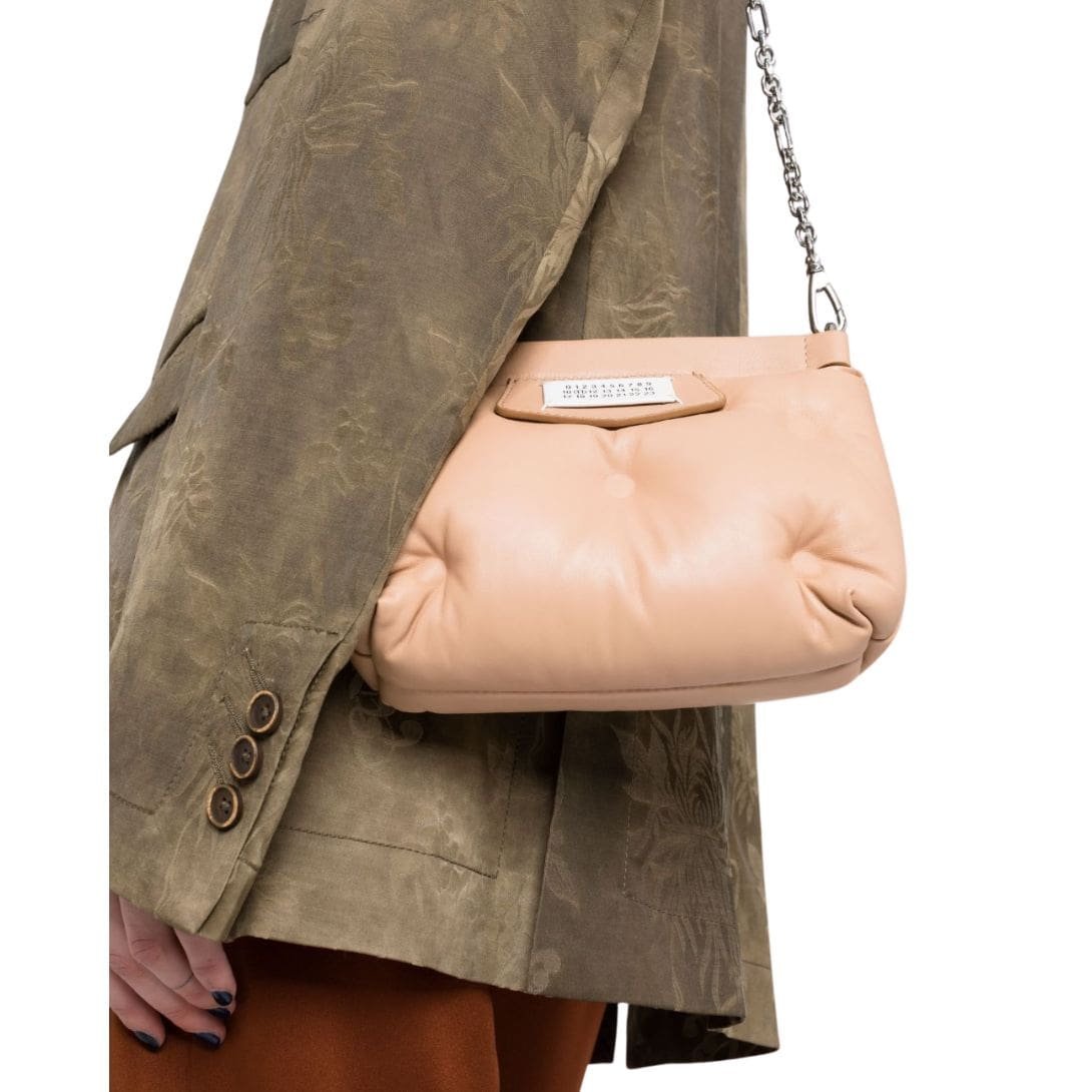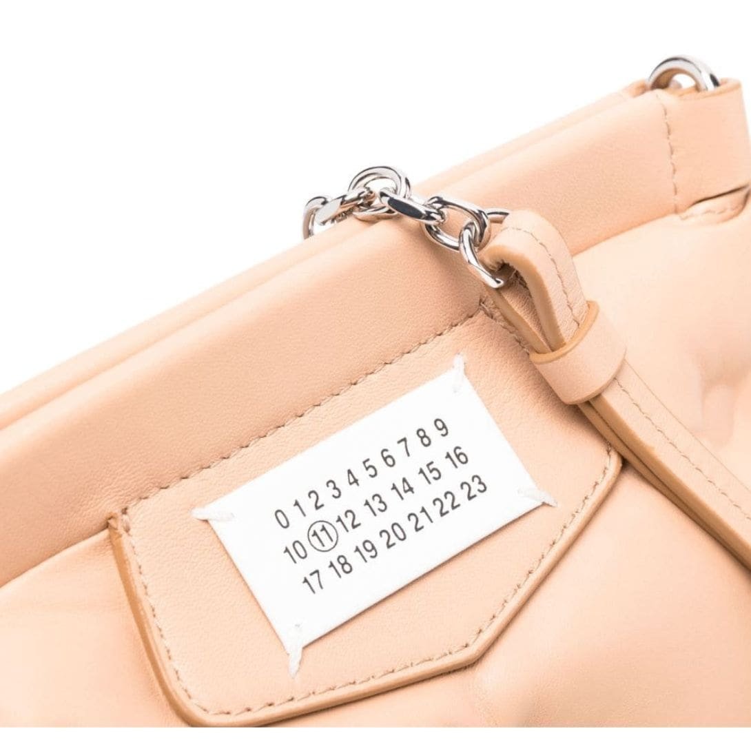 Maison Margiela Mini Glam Slam Red Carpet Crossbody Bag, Crafted in Italy, Maison Margiela offers a compact version of its iconic Glam Slam silhouette. Fashioned from nude leather, it boasts a softly padded exterior with exquisite quilting and silver-tone hardware accents. Adorned with the brand’s logo patch and signature numbers motif, it features a concealed magnetic fastening for security. The bag includes a main compartment, an internal slip pocket, and an internal logo patch for the organization. It comes with a detachable chain-link shoulder strap for versatile styling options.