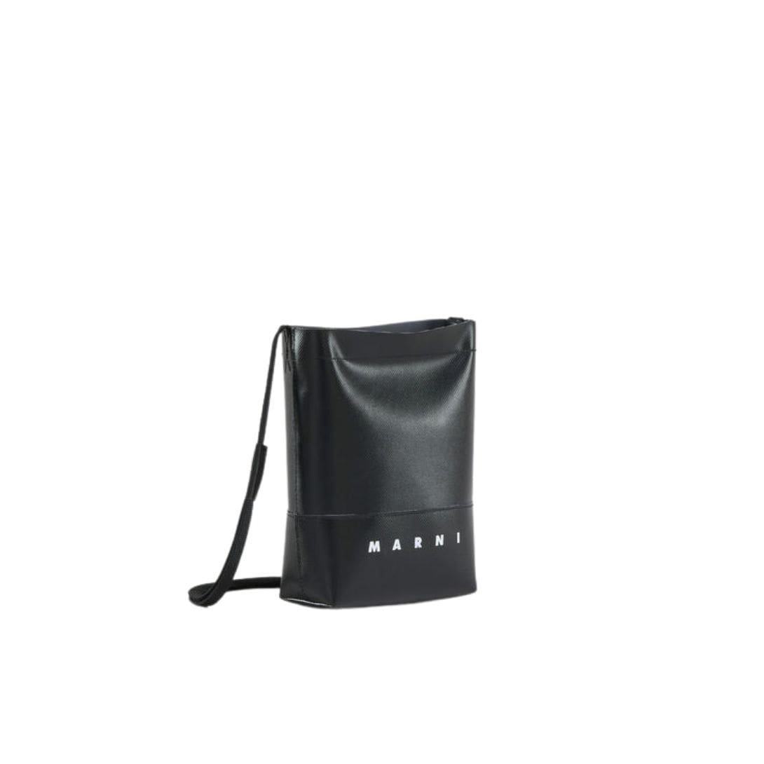 The Marni Black Crossbody Bag with Shoelace Strap is a striking piece that blends contemporary design with playful functionality. Crafted from high-quality black leather, this bag boasts a sleek and minimalist exterior, allowing its unique features to stand out. The structured silhouette is both elegant and practical, making it a versatile accessory for any occasion.