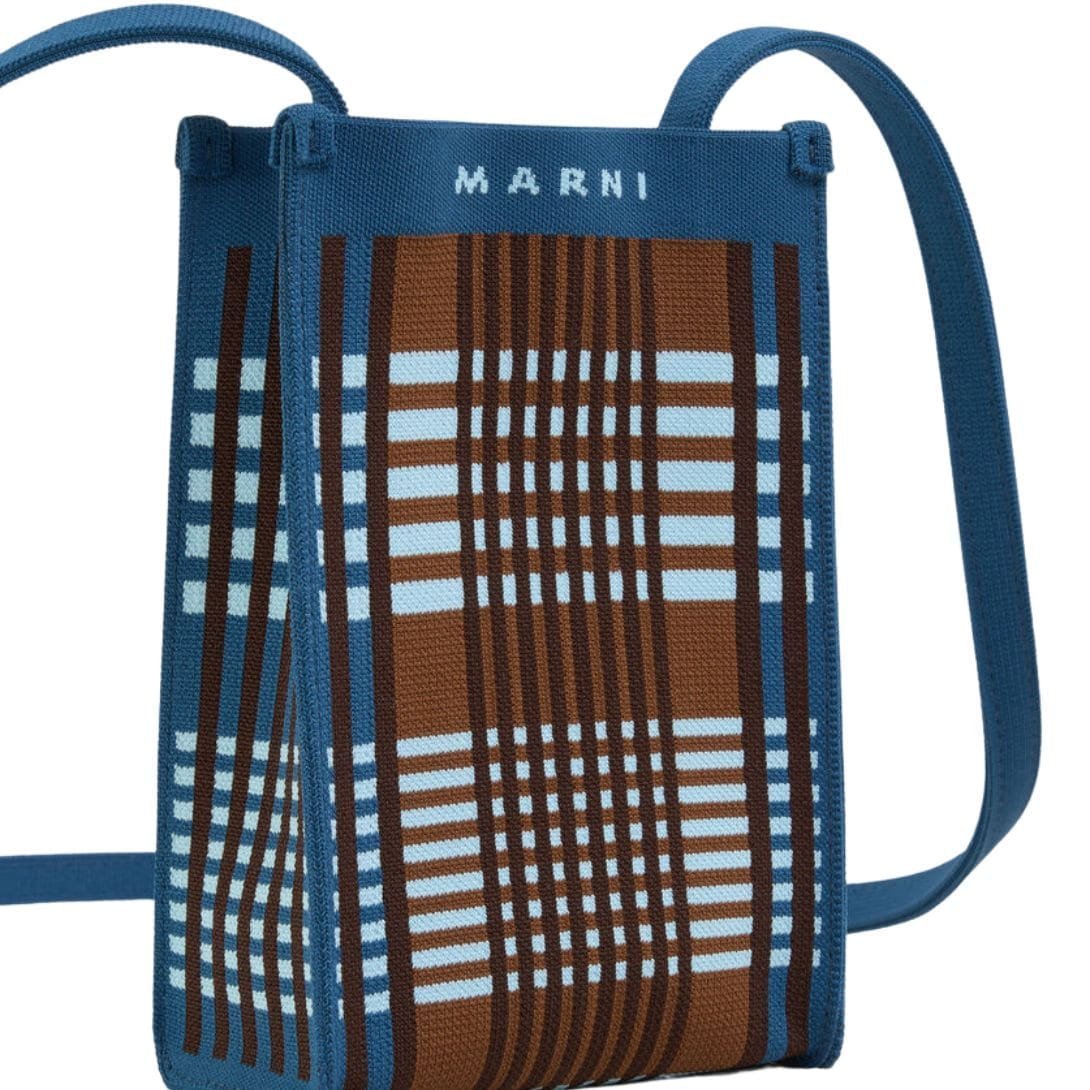 The unique checkered pattern, rendered in a high-quality jacquard fabric, showcases Marni’s commitment to luxury and detail. The interplay of blue and brown tones creates a visually striking effect, while the texture adds depth and dimension to the bag’s overall aesthetic. This design choice not only reflects a modern sensibility but also ensures the bag remains timeless, seamlessly complementing a variety of outfits and occasions.