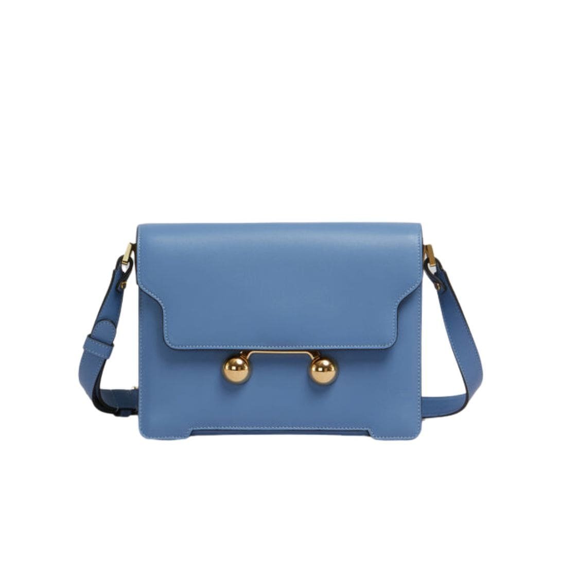Marni Blue Leather Trunkaroo Backpack embodies both sophistication and practicality, making it an exceptional choice for the modern individual. This distinctive accessory, crafted with a striking blue leather, stands out with its elegant color and luxurious feel. Marni, renowned for its commitment to quality and design, has created a piece that seamlessly merges functionality with high fashion.
