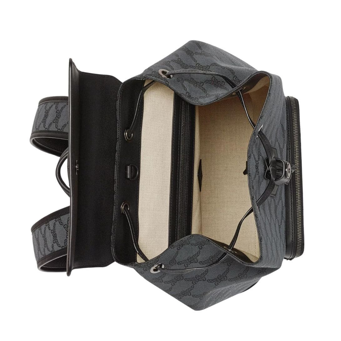 Trimmed with luxurious Spanish calf leather, this backpack exudes elegance and refinement from every angle. The smooth texture and rich tones of the leather complement the Jacquard body, creating a harmonious fusion of textures and patterns that elevate the backpack to new heights of luxury.