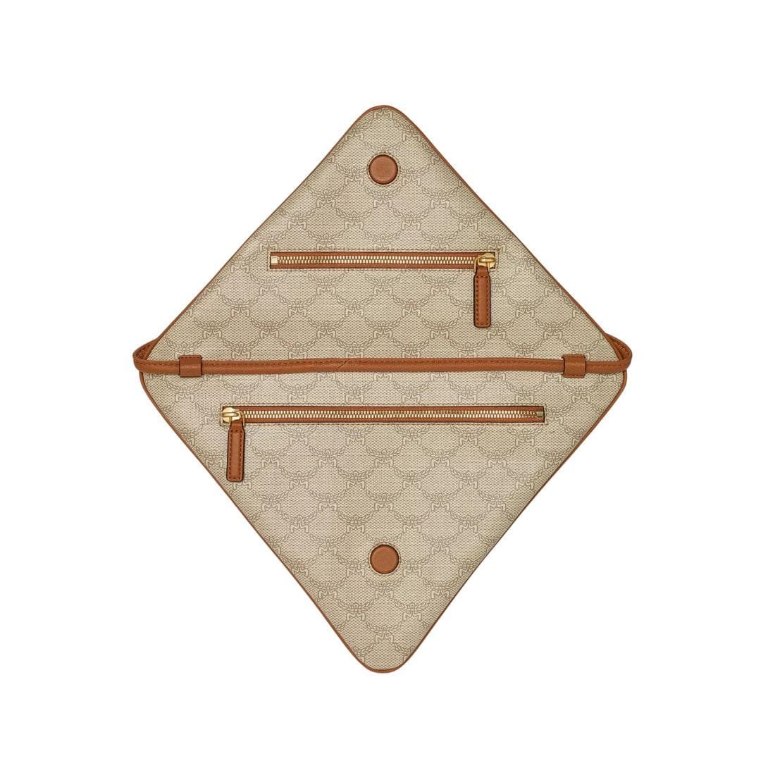 The exterior features the iconic MCM logo motif on the front, showcasing the brand’s heritage and prestige. Additionally, there are front and rear exterior zip pockets, offering easy access to frequently used items. The snap closure provides secure fastening, keeping your belongings safe and organized.
