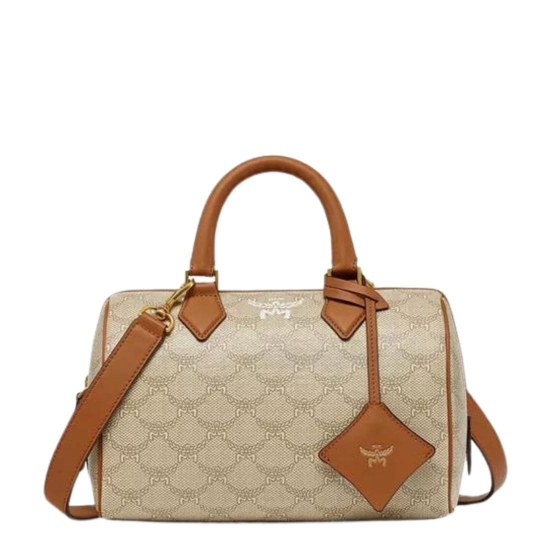 Adding to its practicality is a removable Visetos zip pouch, complete with a leather shoulder strap, offering greater versatility as a standalone purse for short trips or evenings out. The pouch is adorned with the iconic MCM logo plate on the front, symbolizing timeless luxury and sophistication.