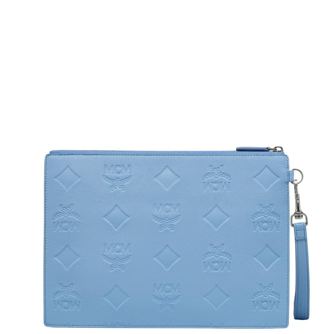 Crafted to perfection, the MCM Maxi Monogram Leather Pouch epitomizes luxury and functionality. The iconic Maxi monogram, featuring classic letters, laurels, and diamonds, is embossed onto full-grain Nappa leather, exuding timeless elegance. Measuring approximately 2.0 x 11.8 x 8.5 inches, this pouch offers ample space to accommodate your essentials with ease.