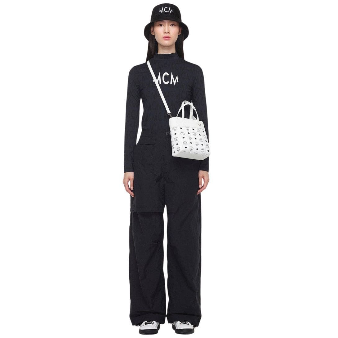 Introducing the Mini Toni Top-Zip Shopper from MCM Mini Toni Top-Zip Shopper In Visetos Leather Mix White, a groundbreaking addition to the Spring-Summer 2023 collection. This innovative design showcases a striking Spanish calf leather trim that envelops the upper portion of the silhouette, setting it apart as a true statement piece.
