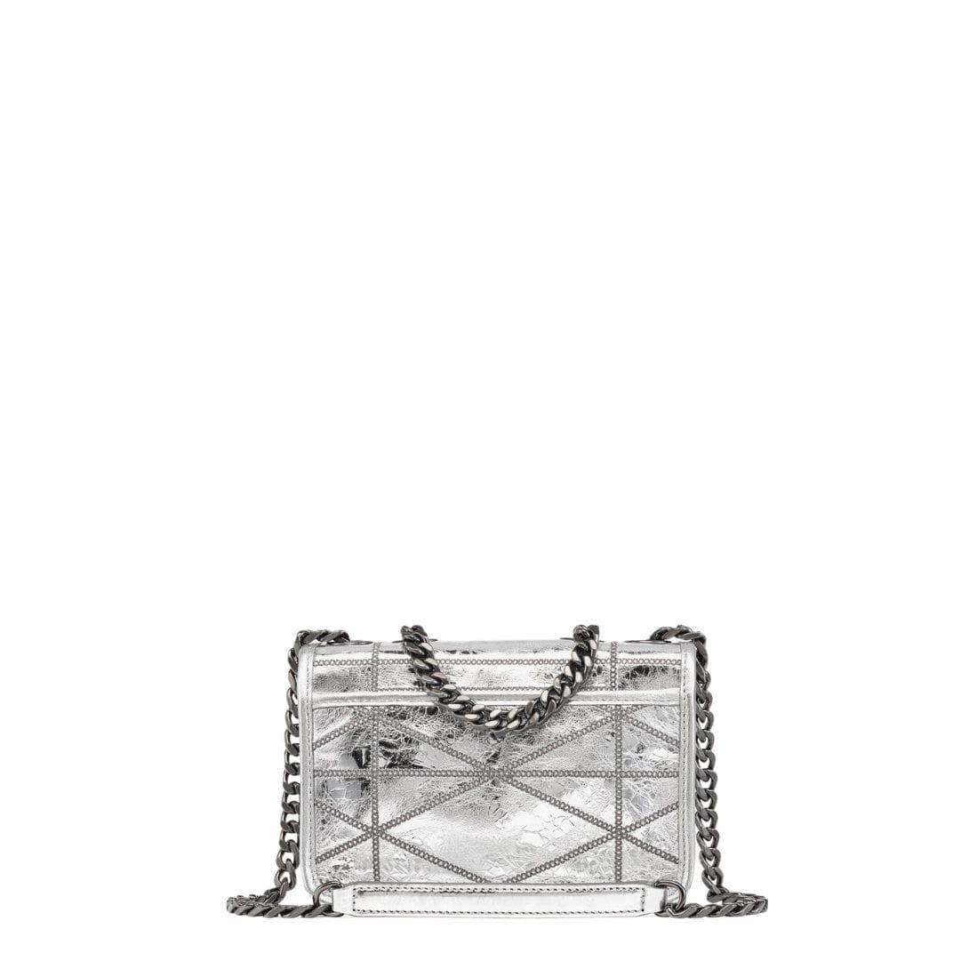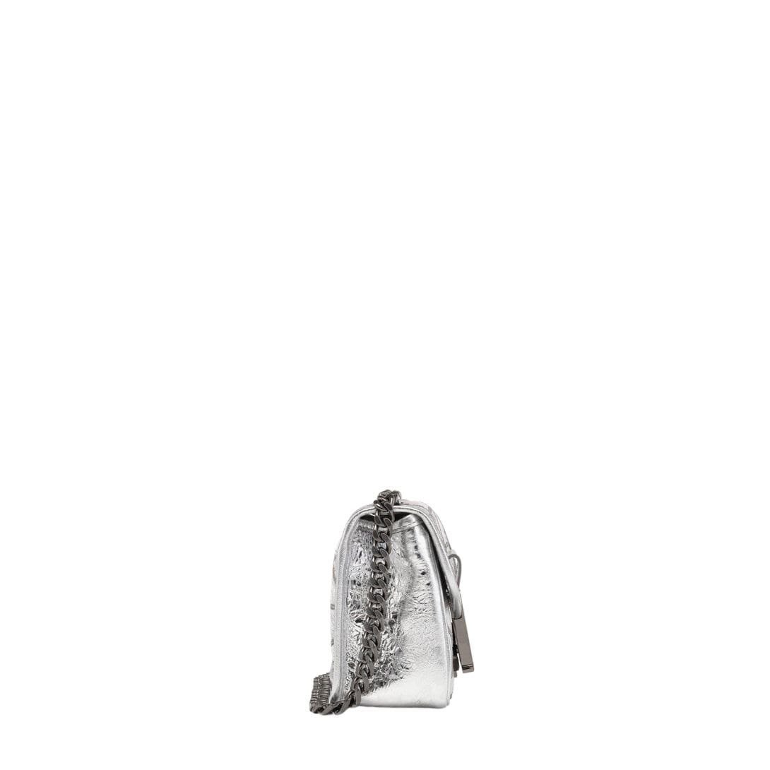 Crafted from luxurious Italian calf leather, the mini quilted shoulder bag from MCM Mini Travia Quilted Shoulder Bag In Crash Calf Leather Silver. is a testament to style and substance. Its naturally distressed surface is adorned with dynamic geometric lines, adding a contemporary edge to the classic silhouette.