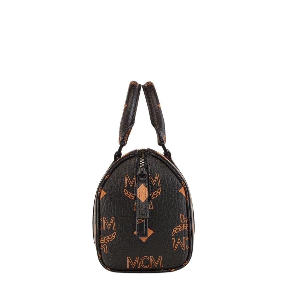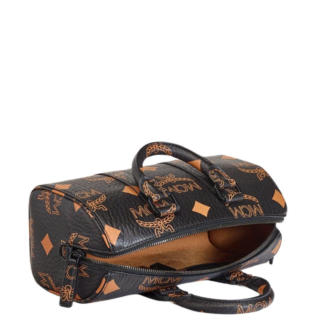The MCM Small Aren Boston Bag In Maxi Visetos Black epitomizes luxury and sophistication, showcasing the brand’s iconic Visetos monogram on a grand scale. Crafted with meticulous attention to detail, this bag features a striking design that highlights the classic letters, laurels, and Bavarian diamonds in a monumental manner.