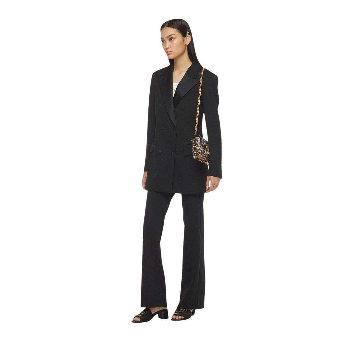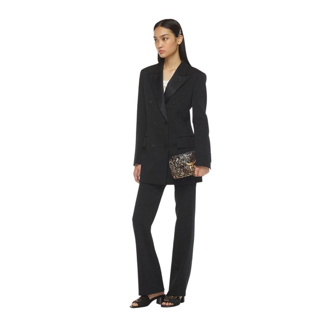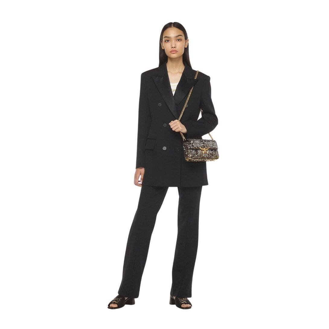 Crafted with meticulous attention to detail, the bag features lamb nappa leather trim, which adds a soft and supple texture to the exterior. The body of the bag is adorned with sequin-embellished fabric, creating a mesmerizing shimmer that catches the light with every movement.