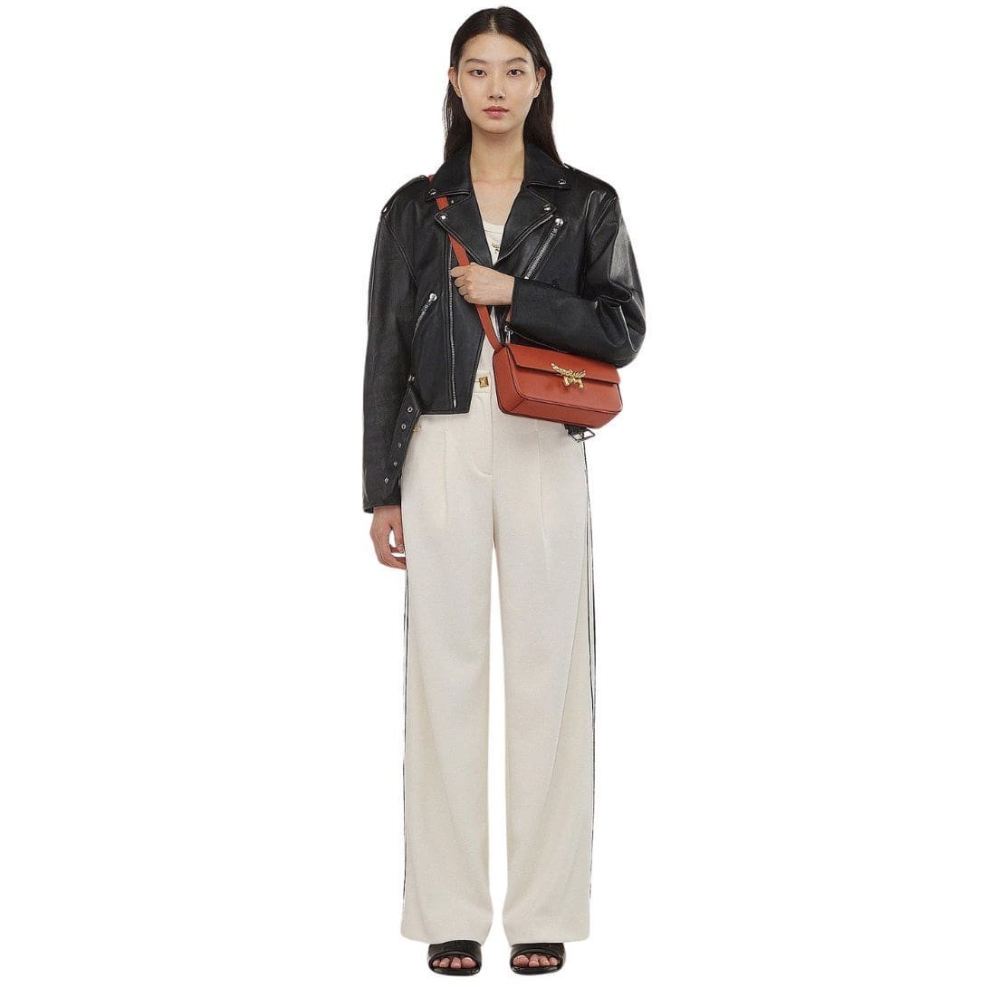 The bag is secured by the noble Laurel emblem in the form of a logo lock closure, adding a touch of regal charm and sophistication. This iconic symbol of MCM’s heritage and prestige elevates the bag’s aesthetic appeal, making it a statement piece for those with discerning taste.