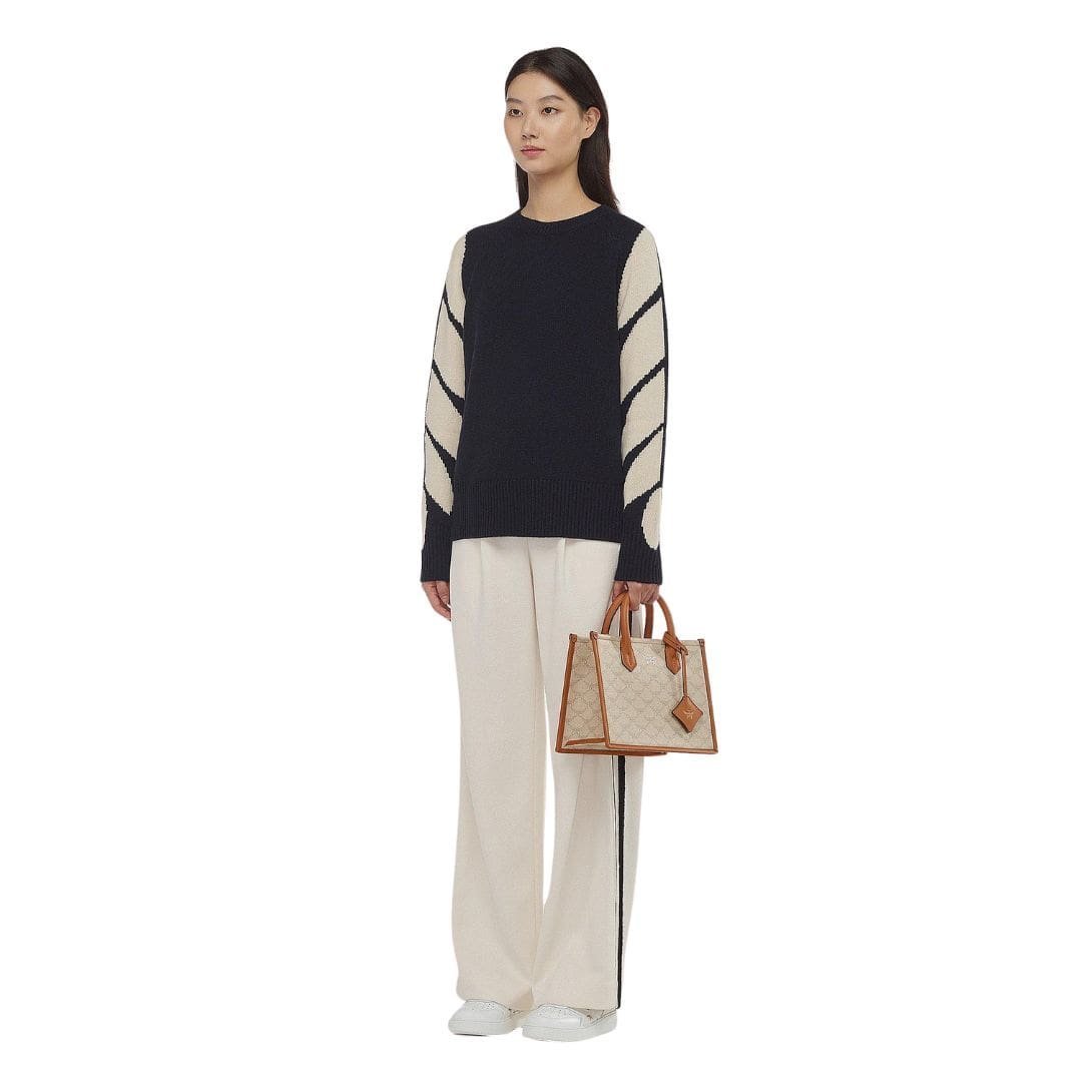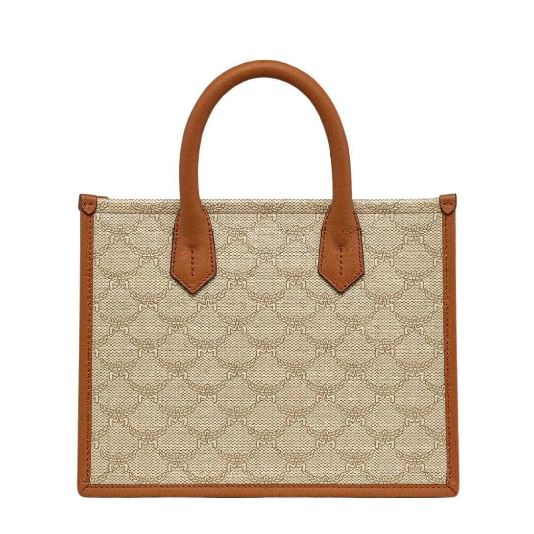Immerse yourself in luxury with this MCM Small Himmel Tote In Lauretos Beige adorned with the noble laurel leaves of the Lauretos monogram, epitomizing timeless elegance. Enhanced by accents of supple nappa leather, including top handles and a detachable hang tag inspired by MCM’s spirit of exploration, this contemporary companion exudes sophistication at every turn.
