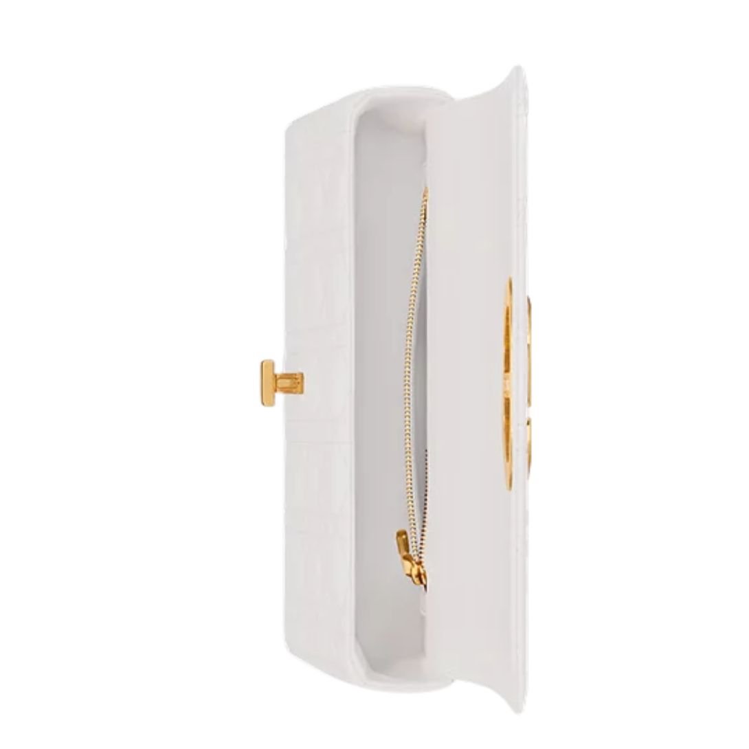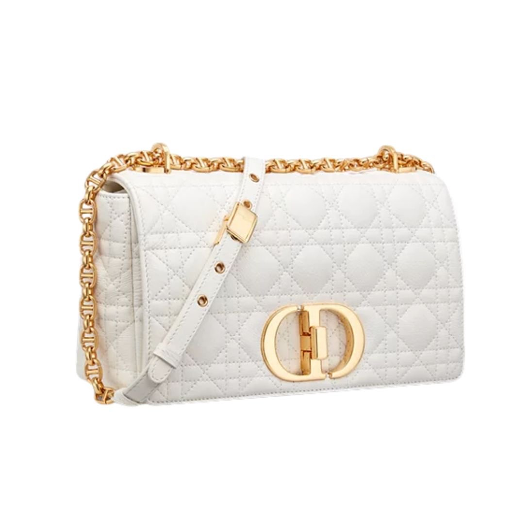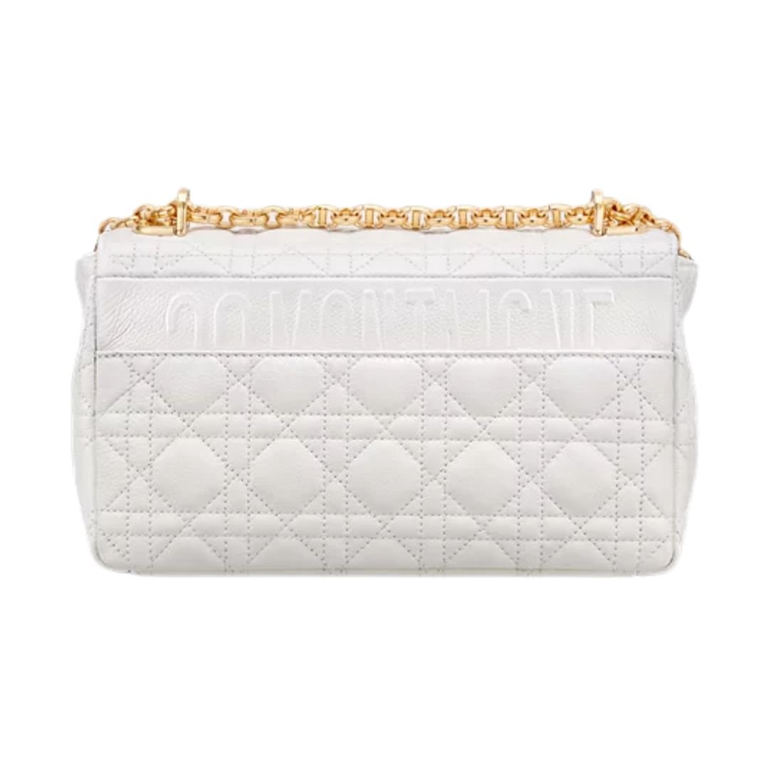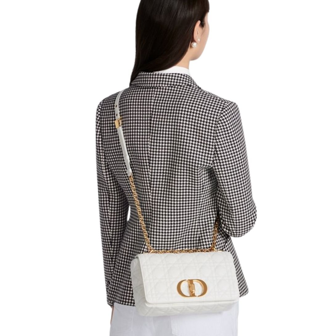 The Dior Caro Bag effortlessly merges contemporary flair with timeless elegance. Crafted in black supple calfskin and finished with the House’s iconic Cannage stitching, this medium-sized piece is distinguished by a flap closure featuring the CD twist clasp—a subtle nod to Christian Dior’s perfume bottle seal. The antique gold-finish chain strap with CD signature links adds a refined touch, while the adjustable and detachable design offers multiple styling options. For added versatility, the chain strap can be replaced with one of Dior’s embroidered shoulder straps, making it suitable for both daywear and evening occasions.