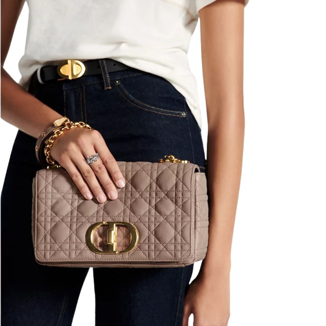 The Dior Caro Bag effortlessly merges contemporary flair with timeless elegance. Crafted in black supple calfskin and finished with the House’s iconic Cannage stitching, this medium-sized piece is distinguished by a flap closure featuring the CD twist clasp—a subtle nod to Christian Dior’s perfume bottle seal. The antique gold-finish chain strap with CD signature links adds a refined touch, while the adjustable and detachable design offers multiple styling options. For added versatility, the chain strap can be replaced with one of Dior’s embroidered shoulder straps, making it suitable for both daywear and evening occasions.