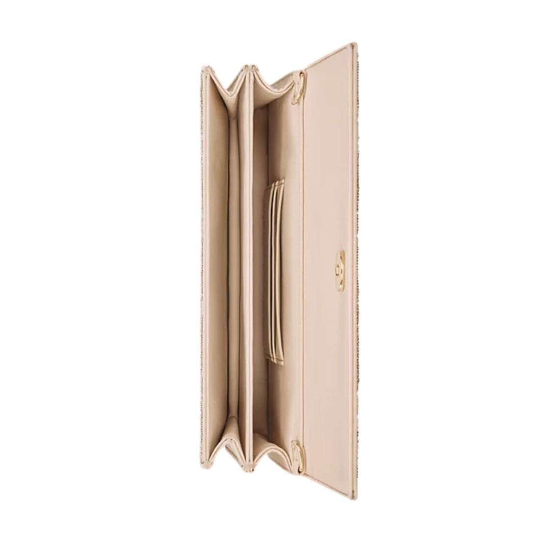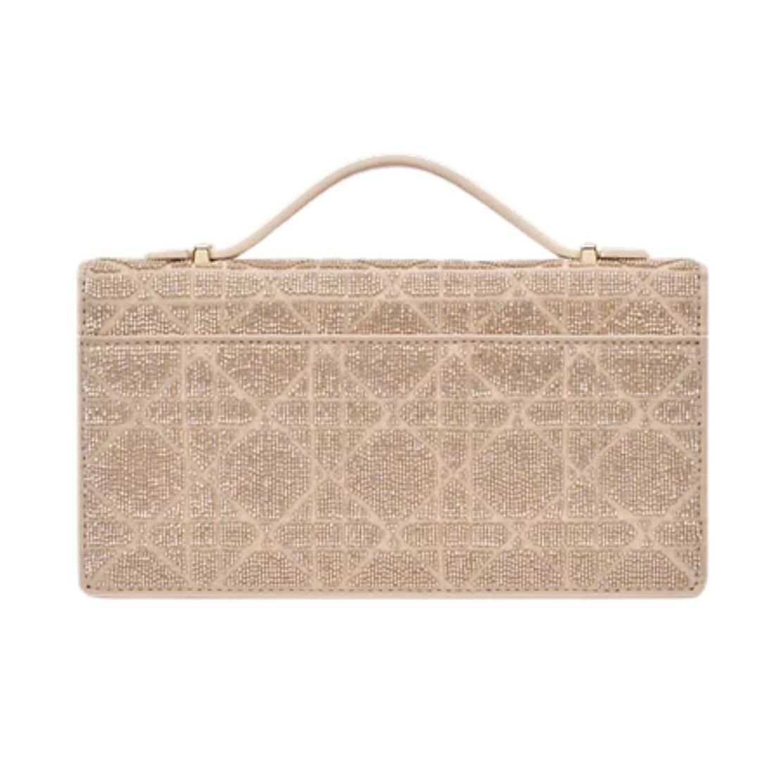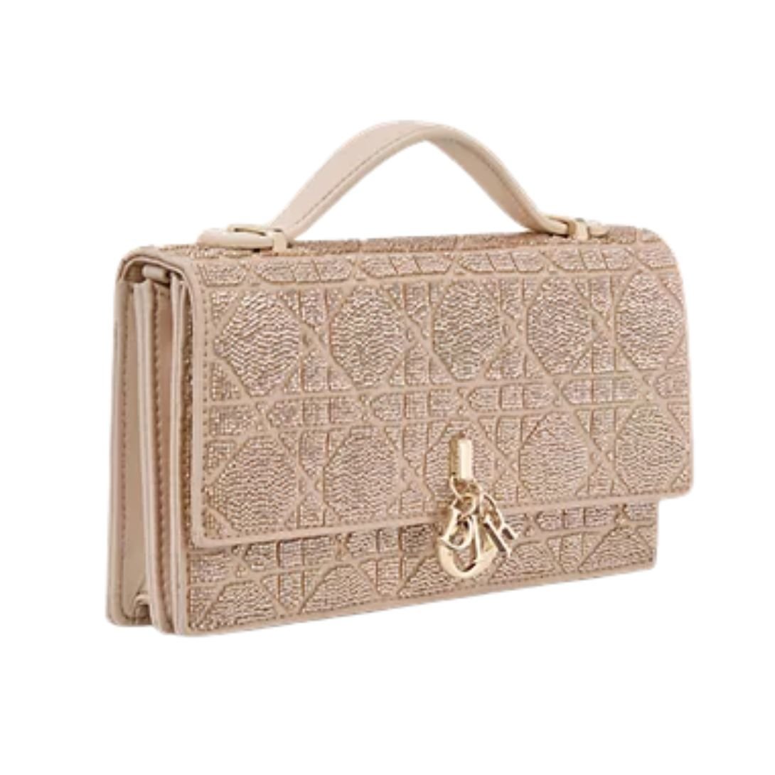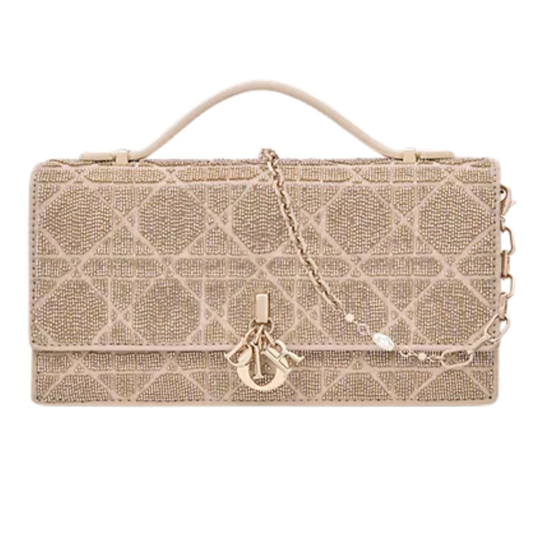 The front flap is adorned with delicate D.I.O.R. charms, while the compact silhouette opens to reveal two interior compartments, a rear slip pocket, and integrated card slots—perfect for organizing essentials. A structured leather top handle offers versatile carry options, complemented by a removable jewel chain strap adorned with resin pearls for a sophisticated touch.