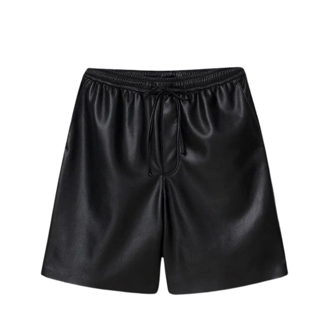 The use of OKOBOR™ material further enhances the appeal of the Novan shorts. Developed by Nanushka, OKOBOR™ represents a groundbreaking innovation sustainably, offering all the luxurious qualities of genuine leather without environmental impact or ethical concerns. This cruelty-free fabrication not only reflects Nanushka’s commitment to responsible sourcing and production but also delivers a tactile experience that rivals that of traditional leather.