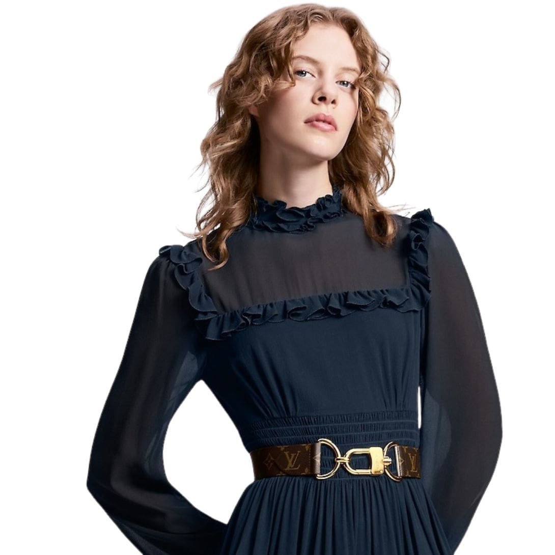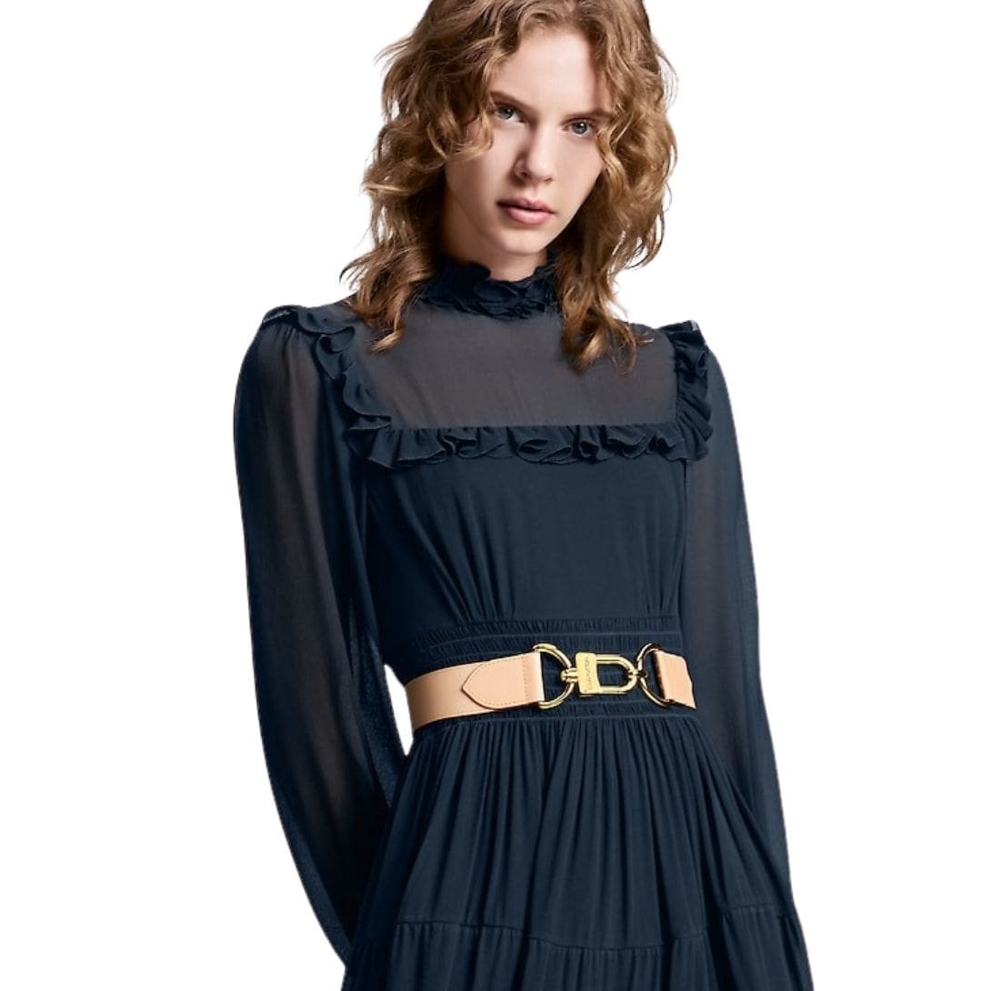 At the heart of the belt lies its strikingly original buckle: a gold-finish snap hook inspired by the House’s iconic leather goods. This distinctive feature serves as the focal point of the accessory, instantly catching the eye and exuding a sense of luxury and sophistication. The oversized design of the hook adds a contemporary twist, making a bold statement that commands attention.