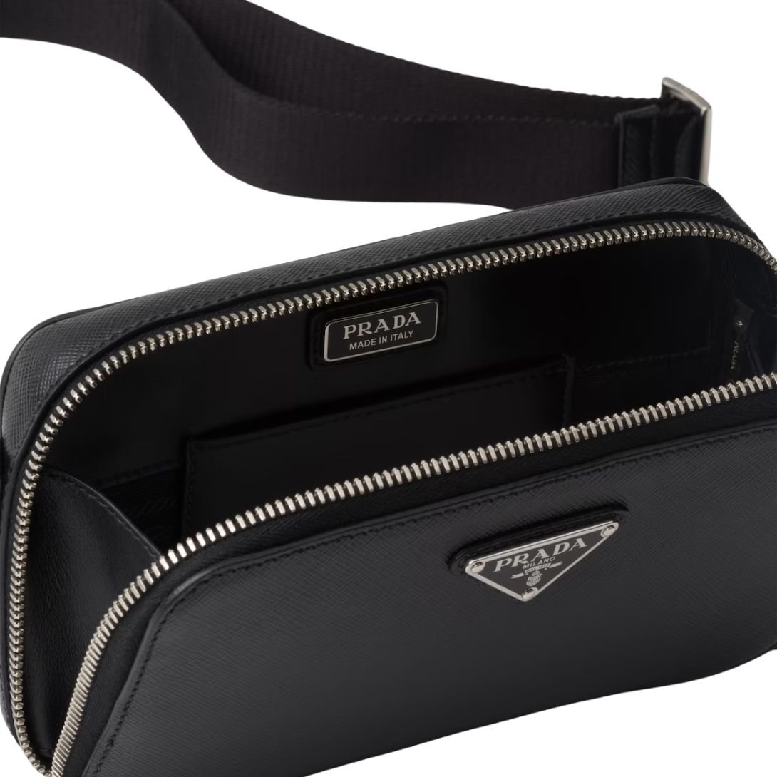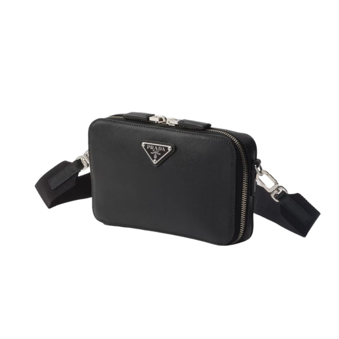 The detachable and adjustable shoulder strap, combining nylon tape and leather, lends a sporty-chic edge, while the enameled metal triangle logo on the front delivers a bold nod to Prada’s heritage. With a secure zipper closure and organized interior, this compact bag is ideal for essentials on the go.