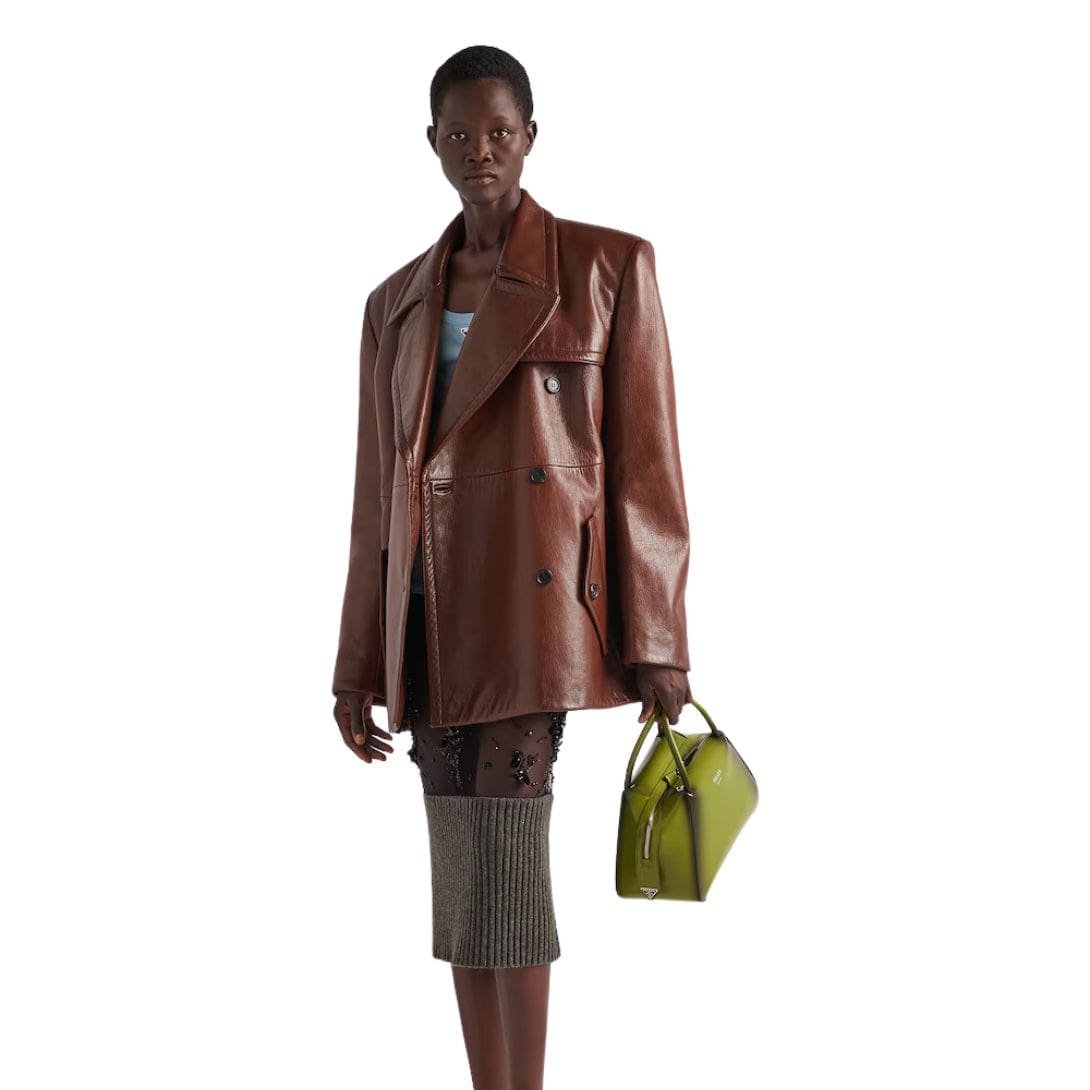Attention to detail is evident in every aspect of the jacket’s construction. Intricately stitched seams and precision-cut panels showcase Prada’s impeccable craftsmanship, ensuring a flawless finish that stands the test of time. The rich, buttery texture of the leather not only feels indulgently soft against the skin but also adds a luxurious dimension to the garment, elevating its overall aesthetic.