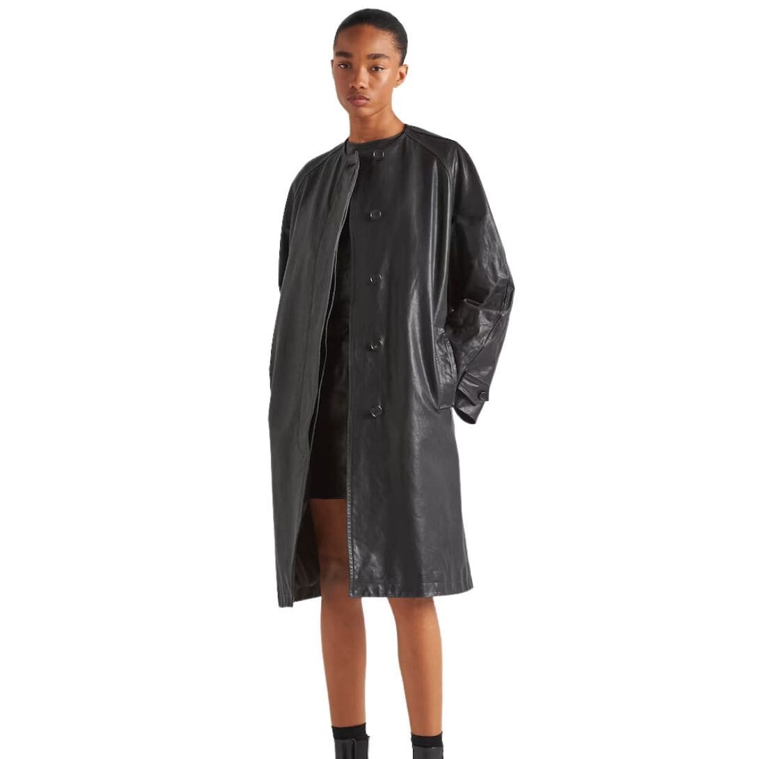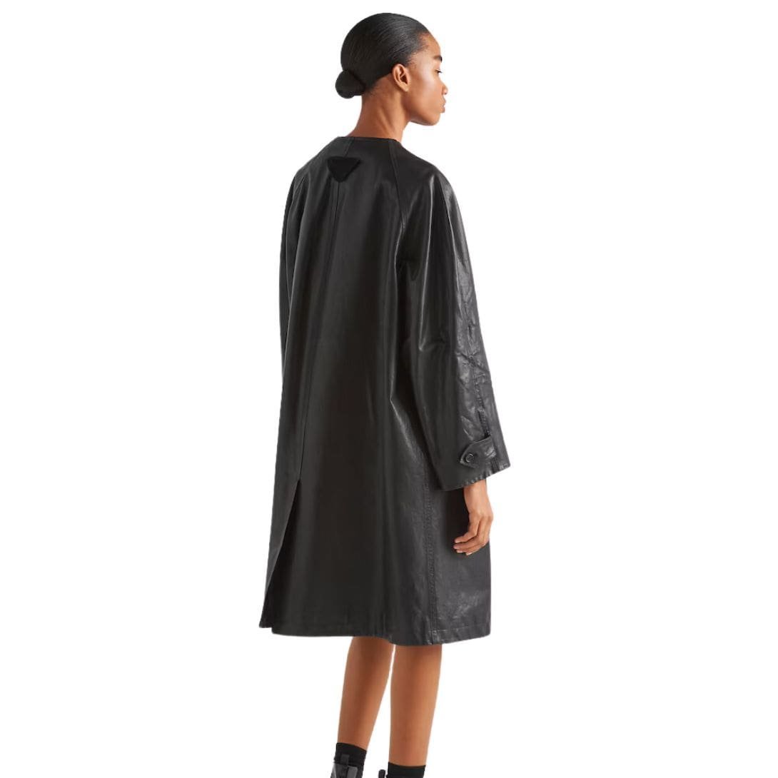 Designed to seamlessly blend style with functionality, the coat features a minimalist yet striking aesthetic. Its clean lines and understated elegance make it a versatile addition to any wardrobe, effortlessly transitioning from day to night and complementing a myriad of outfits. Whether paired with tailored trousers for a polished office look or draped over a cocktail dress for a glamorous evening ensemble, the Prada Leather Coat adds an instant touch of sophistication to any ensemble.