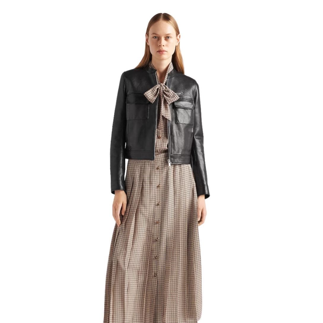 The silhouette of the Prada leather jacket is sleek and tailored, flattering the wearer’s form with precision. Its clean lines and minimalist aesthetic make it a versatile piece, seamlessly transitioning from day to night, from casual outings to formal events. Whether paired with denim for a relaxed vibe or layered over a dress for a more polished look, the Prada leather jacket adds an instant touch of luxury to any ensemble.