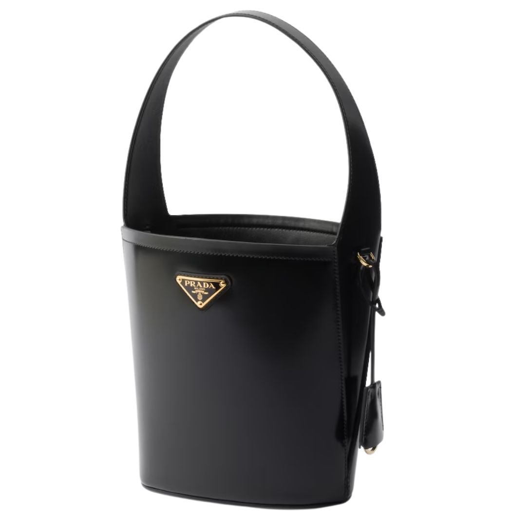 Defined by its clean lines and architectural structure, this Prada bucket bag embodies minimalist elegance with a versatile edge. Crafted in smooth brushed leather, the silhouette is both contemporary and timeless—ideal for elevating everyday ensembles.