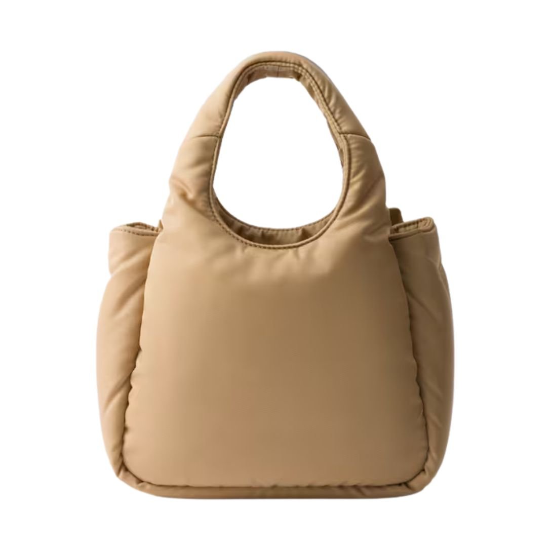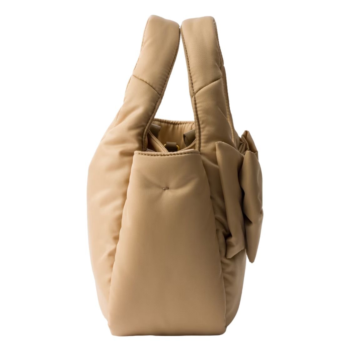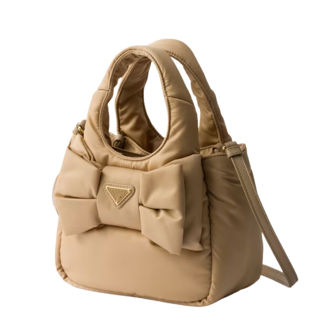 Delicately bold and distinctly modern, this Prada padded Re-Nylon bag redefines feminine elegance through the lens of contemporary design. Its soft, structured silhouette is brought to life by an oversized bow—a statement of romantic minimalism and new-era sophistication.