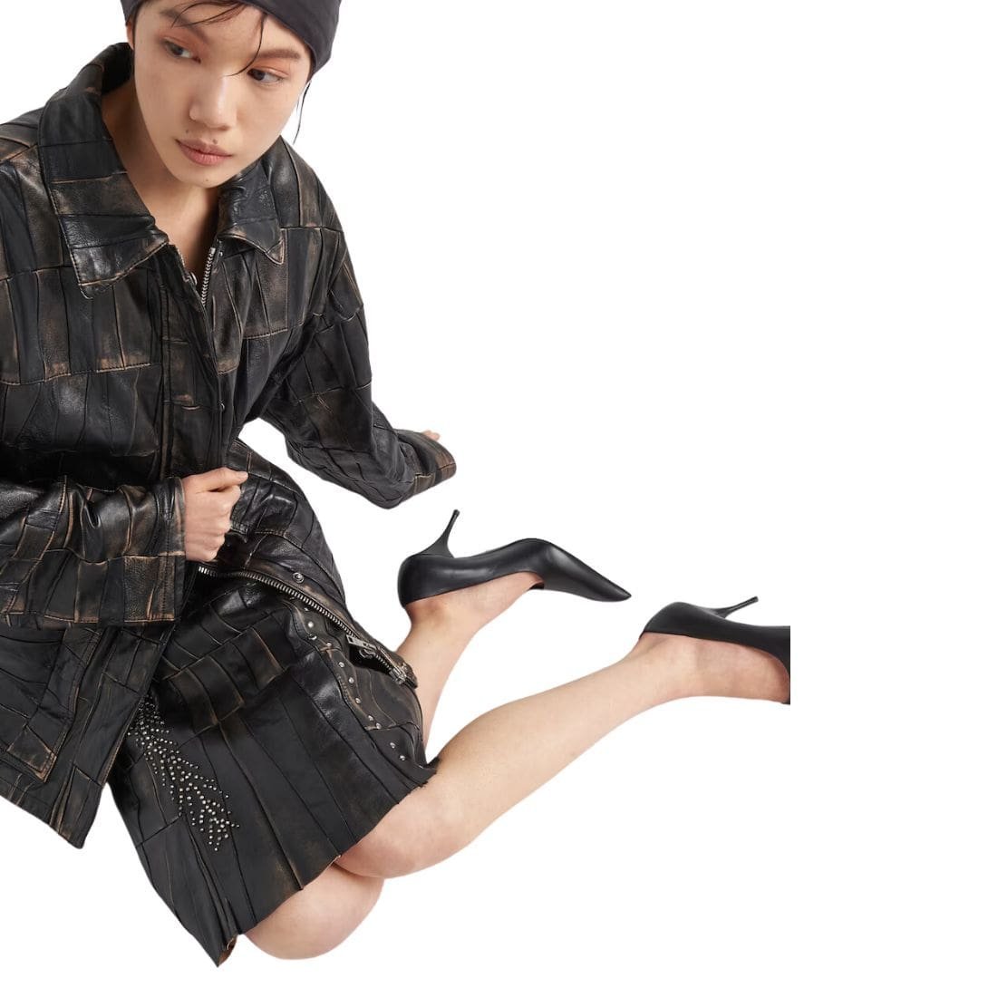 The Prada Nappa Leather Patchwork Skirt is a striking embodiment of high fashion craftsmanship and avant garde design. This luxurious piece features a sophisticated patchwork pattern that harmoniously blends various textures and hues of Nappa leather, a material renowned for its suppleness and smooth finish. The skirt’s unique aesthetic is a testament to Prada’s commitment to innovative fashion, showcasing a meticulous assembly of irregularly shaped leather patches that create a dynamic, mosaic-like effect.PRADA NAPPA LEATHER PATCHORK SKIRT