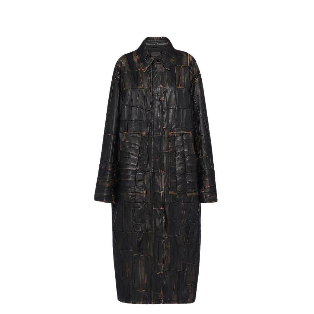 The design of the coat features an intricate patchwork pattern, creating a visually captivating mosaic of leather pieces in various shades and finishes. Each patch is carefully selected and assembled, showcasing a harmonious balance of color and texture that adds depth and dimension to the overall look. The patchwork technique not only highlights Prada’s dedication to artisanal detail but also gives the coat a unique, one-of-a-kind aesthetic.