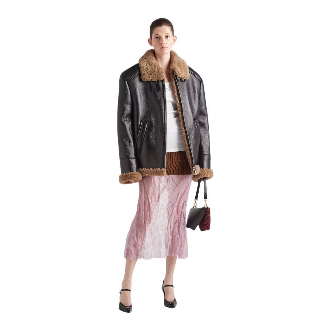 In essence, the Prada Oversized Shearling Jacket is a luxurious and practical outerwear choice that seamlessly blends comfort, style, and high-end craftsmanship. It is a perfect example of how Prada continues to push the boundaries of fashion, creating pieces that are both contemporary and enduring.