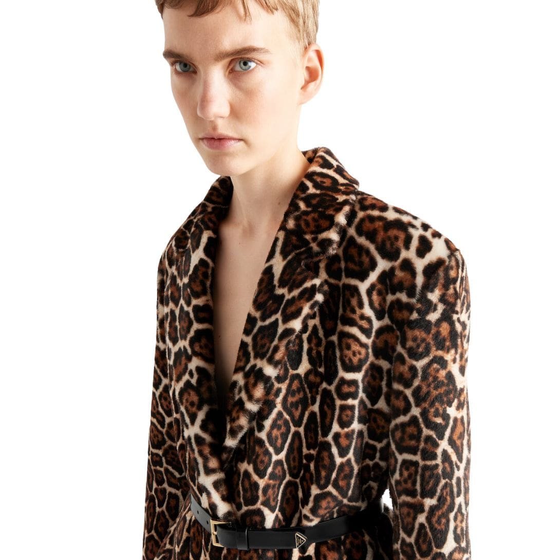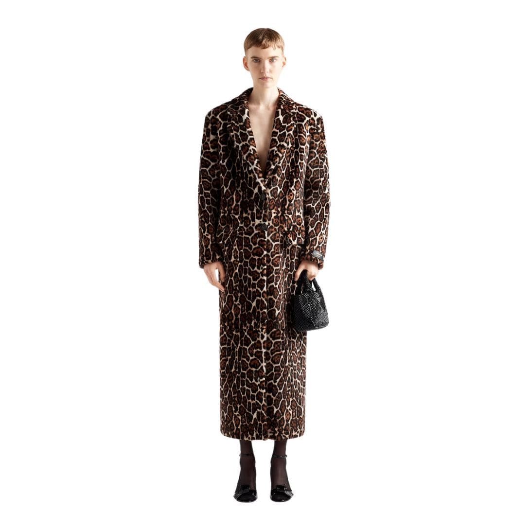 At first glance, the coat captivates with its striking print, a hallmark of Prada’s daring approach to design. The intricate pattern combines modern aesthetics with a nod to traditional motifs, creating a visually engaging piece that stands out in any setting. The print is meticulously applied, ensuring that each coat is a unique masterpiece.