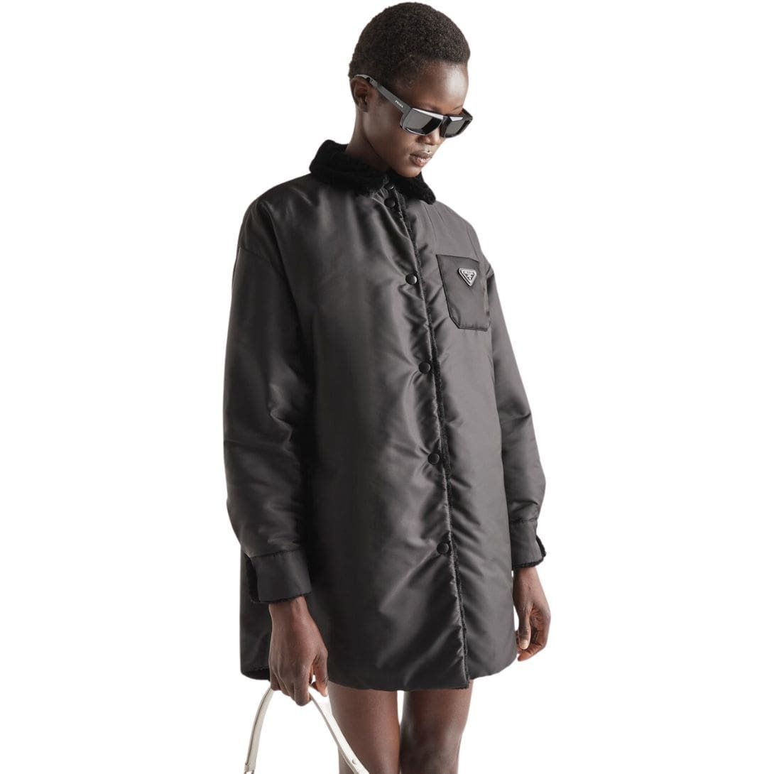 One side of the coat features Prada’s signature gabardine fabric, known for its durability, water resistance, and sophisticated matte finish. This smooth, structured side exudes a sleek, urban elegance, perfect for a polished and contemporary appearance. The gabardine is meticulously tailored, showcasing Prada’s commitment to impeccable craftsmanship and attention to detail. It includes practical elements like a pointed collar, button-front closure, and spacious pockets that add to its functionality without compromising its stylish appeal.
